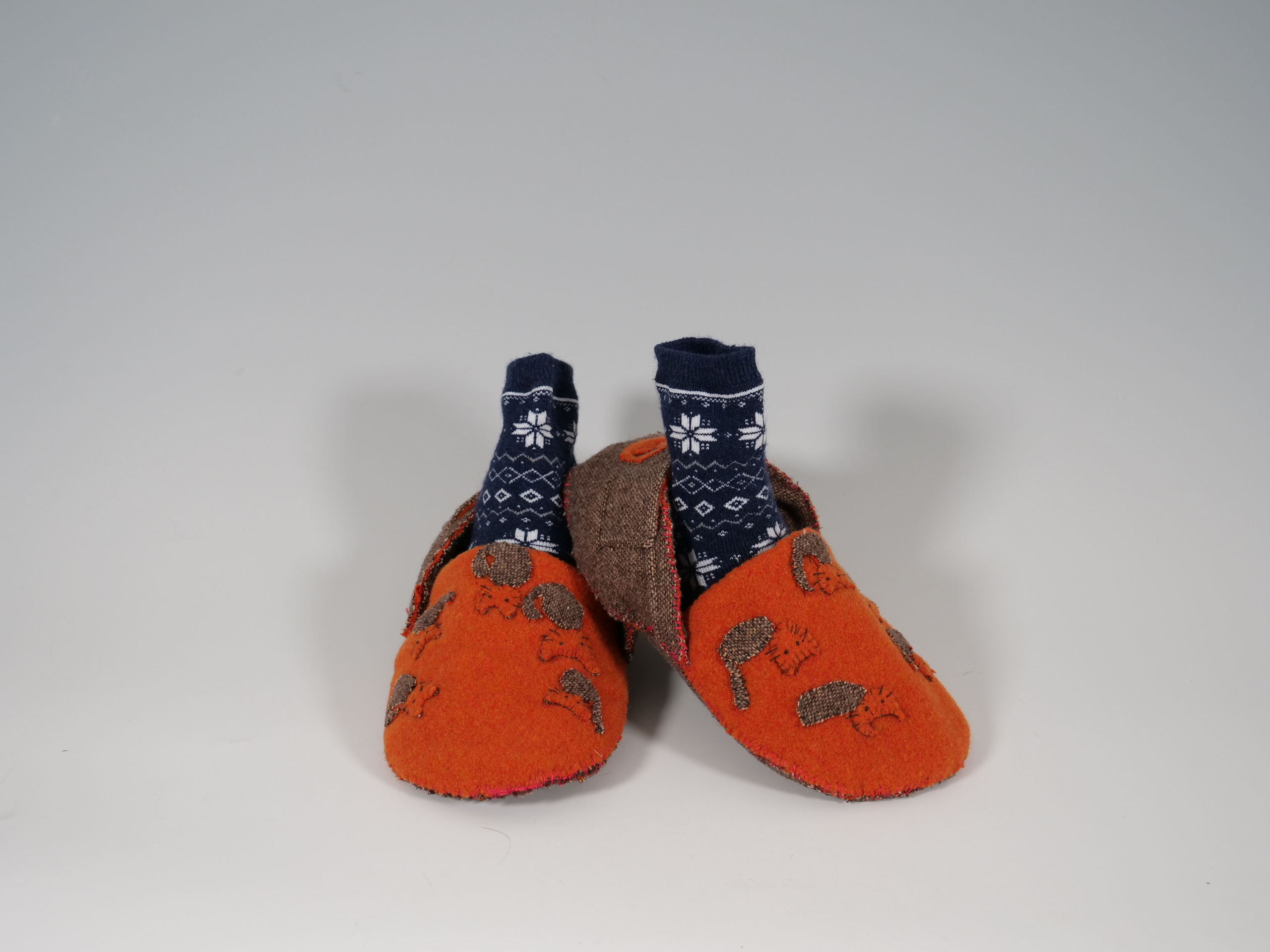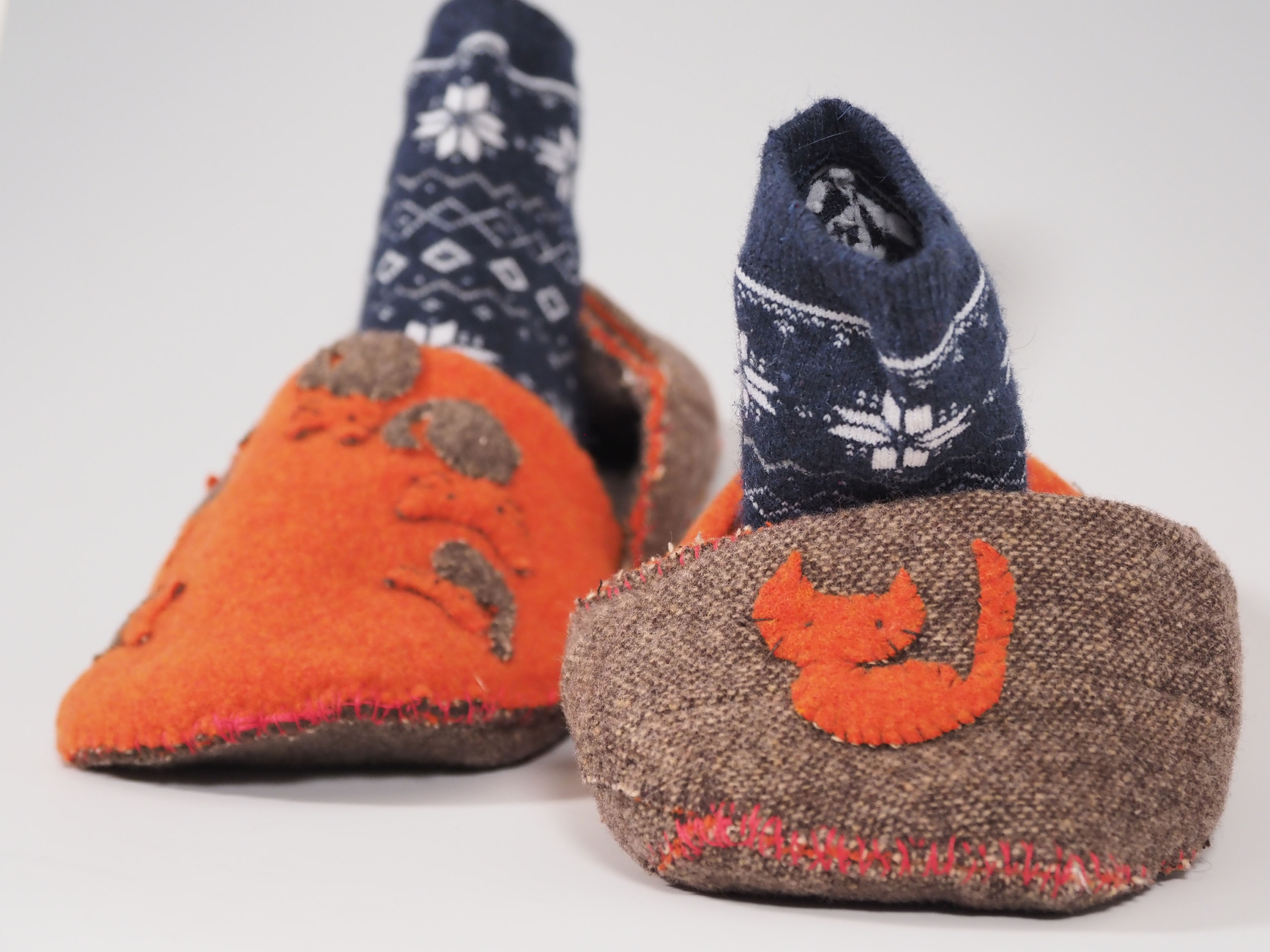 今回は、母と二人で室内履きづくりにチャレンジしました。思い出のある洋服のリメークです。できあがりに、足を入れると、想像をこえた、暖かさに思わず「ニヤリ」大切な思い出の服です。その思いとともに「いのちの息吹」をふたたび、足元から全身で感じることができました。家族3人、3足の室内履きの完成です。