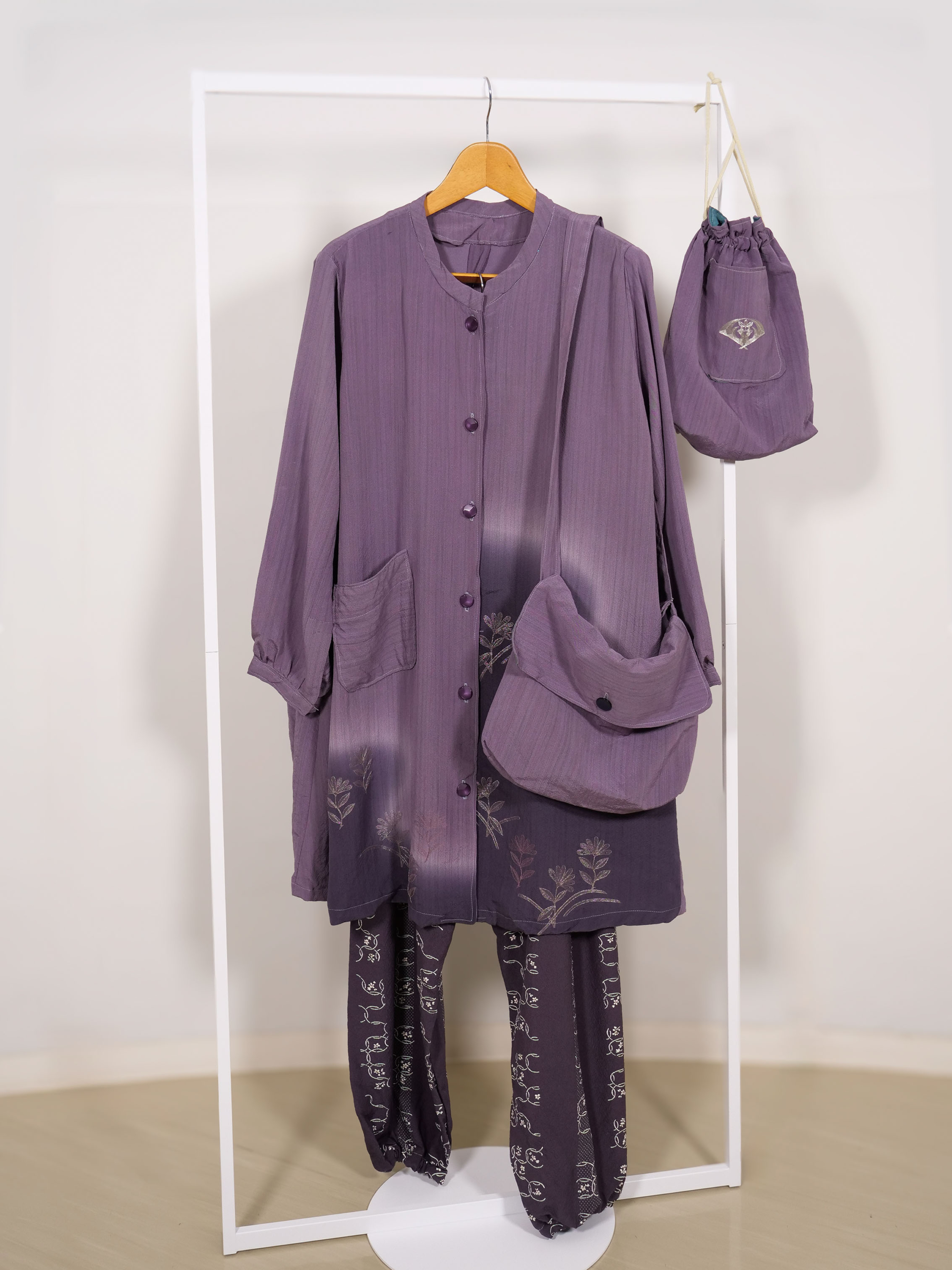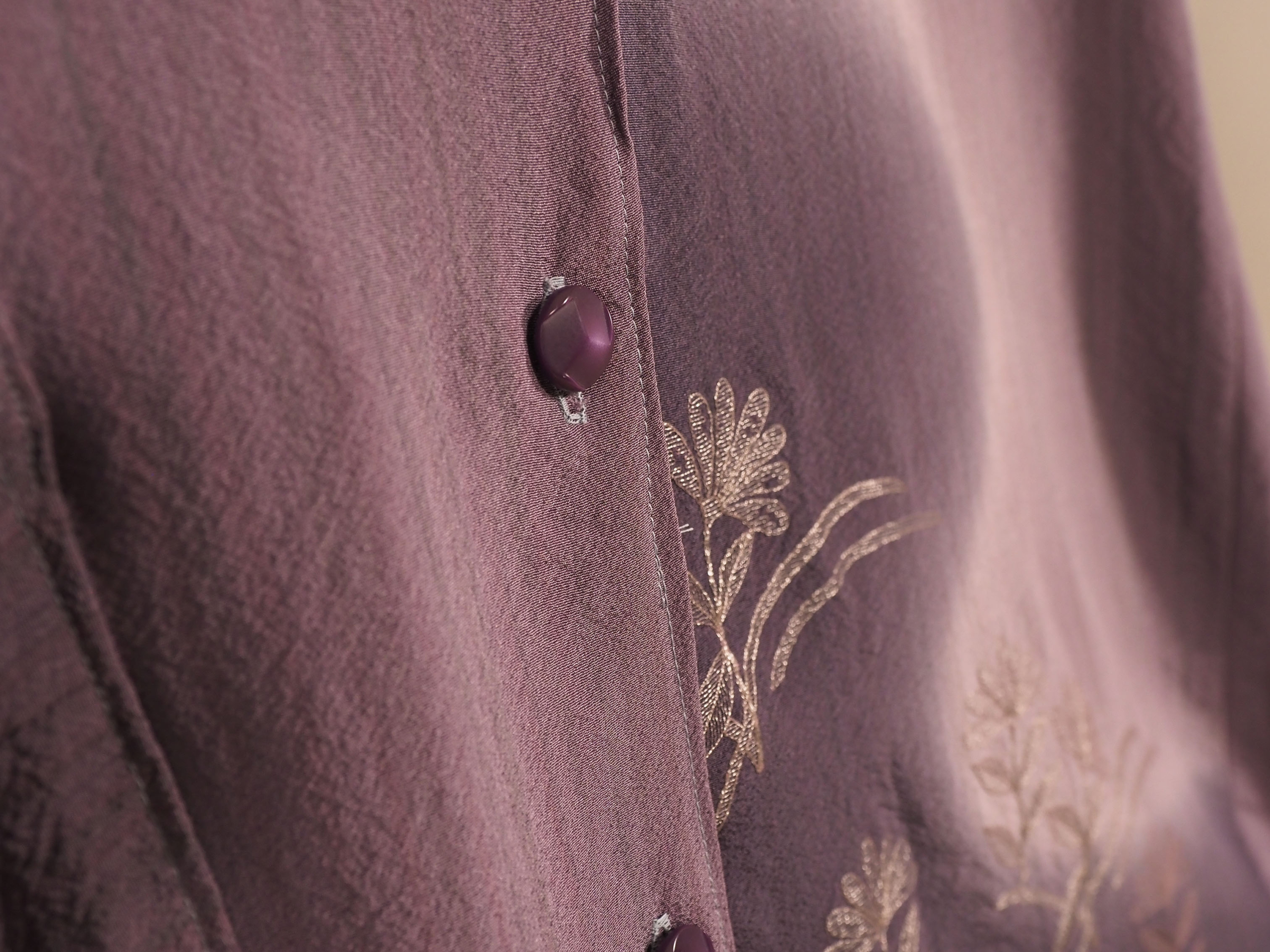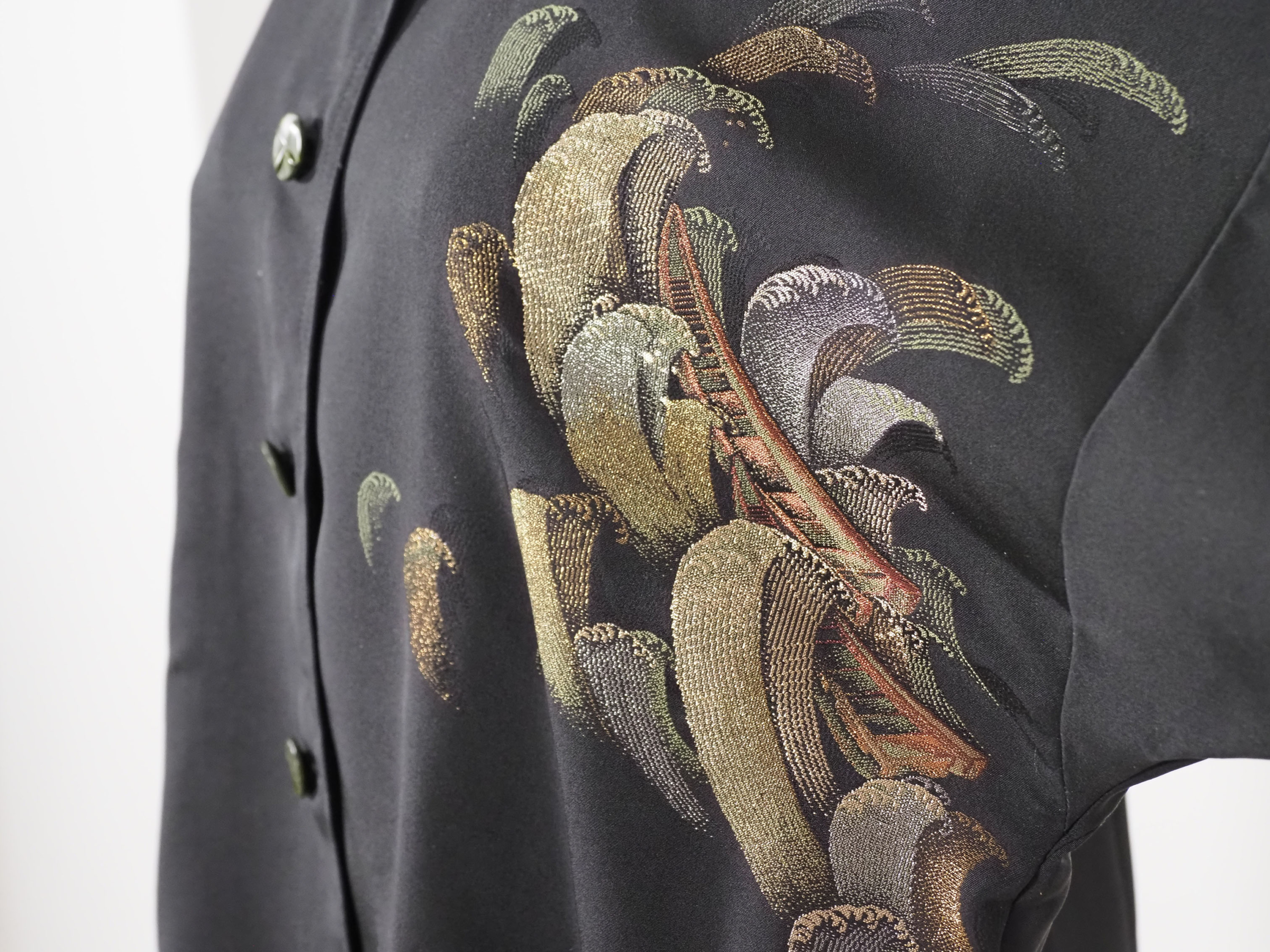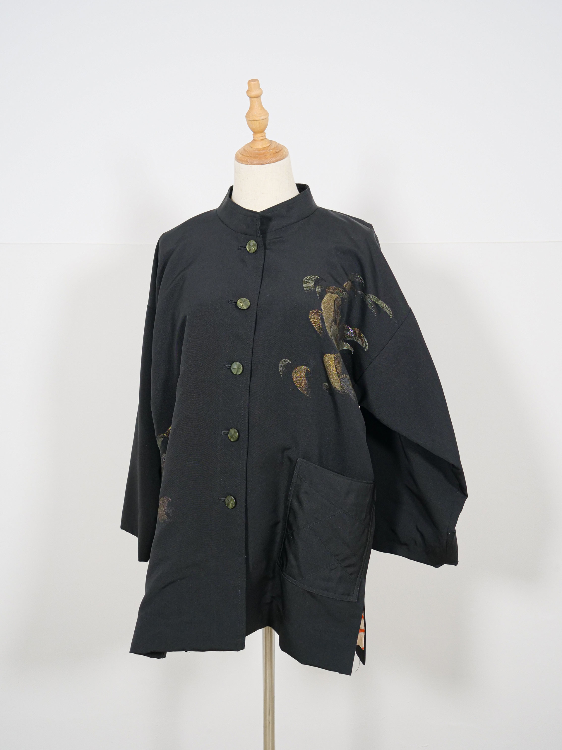 母の残した絵羽織を解いて普段から着られるように絵柄を大小に分け配置を考えた。和服の名残を残したく、袖全体をゆるやかにして残り布で大きなポケットを付けた。