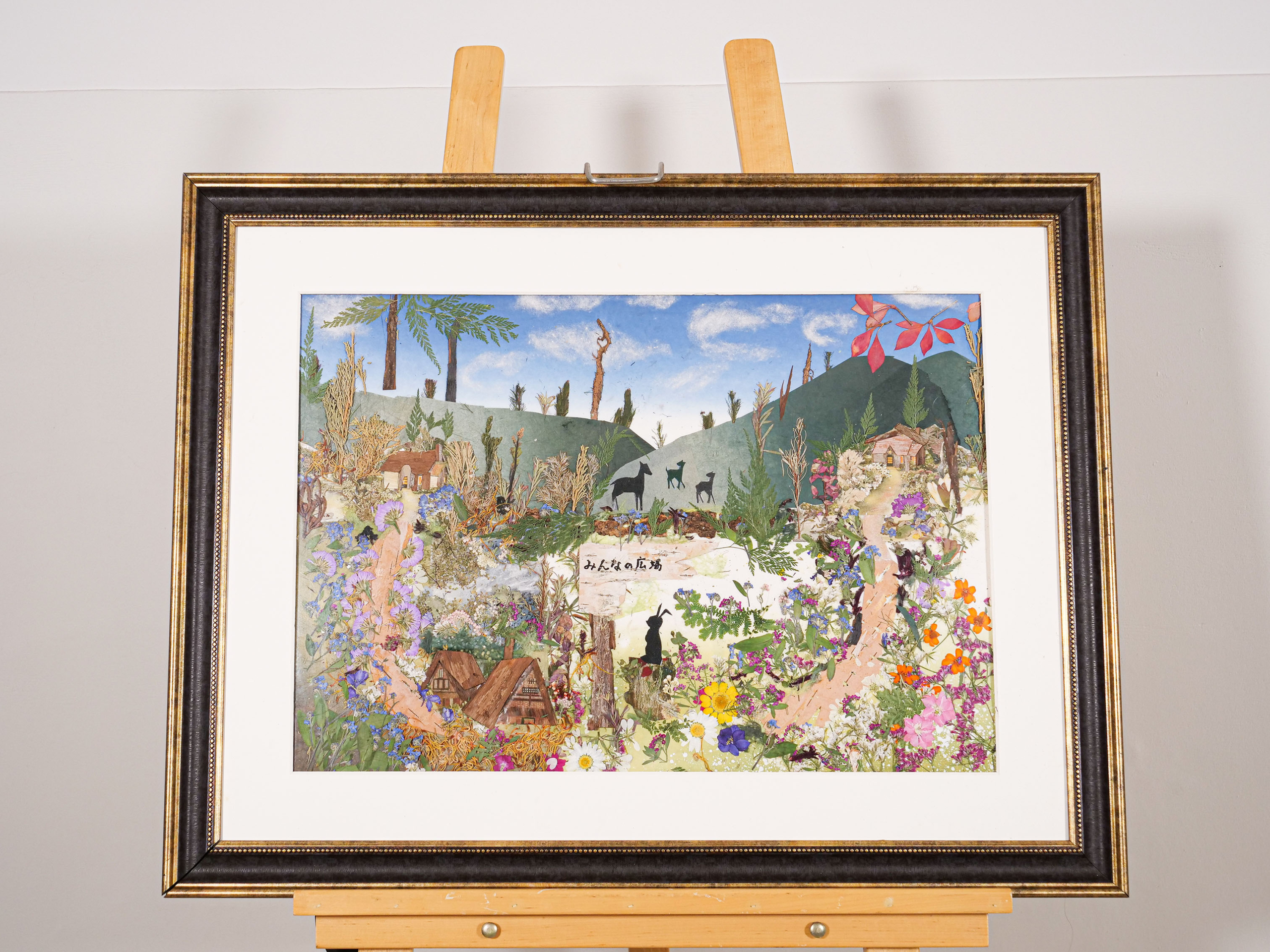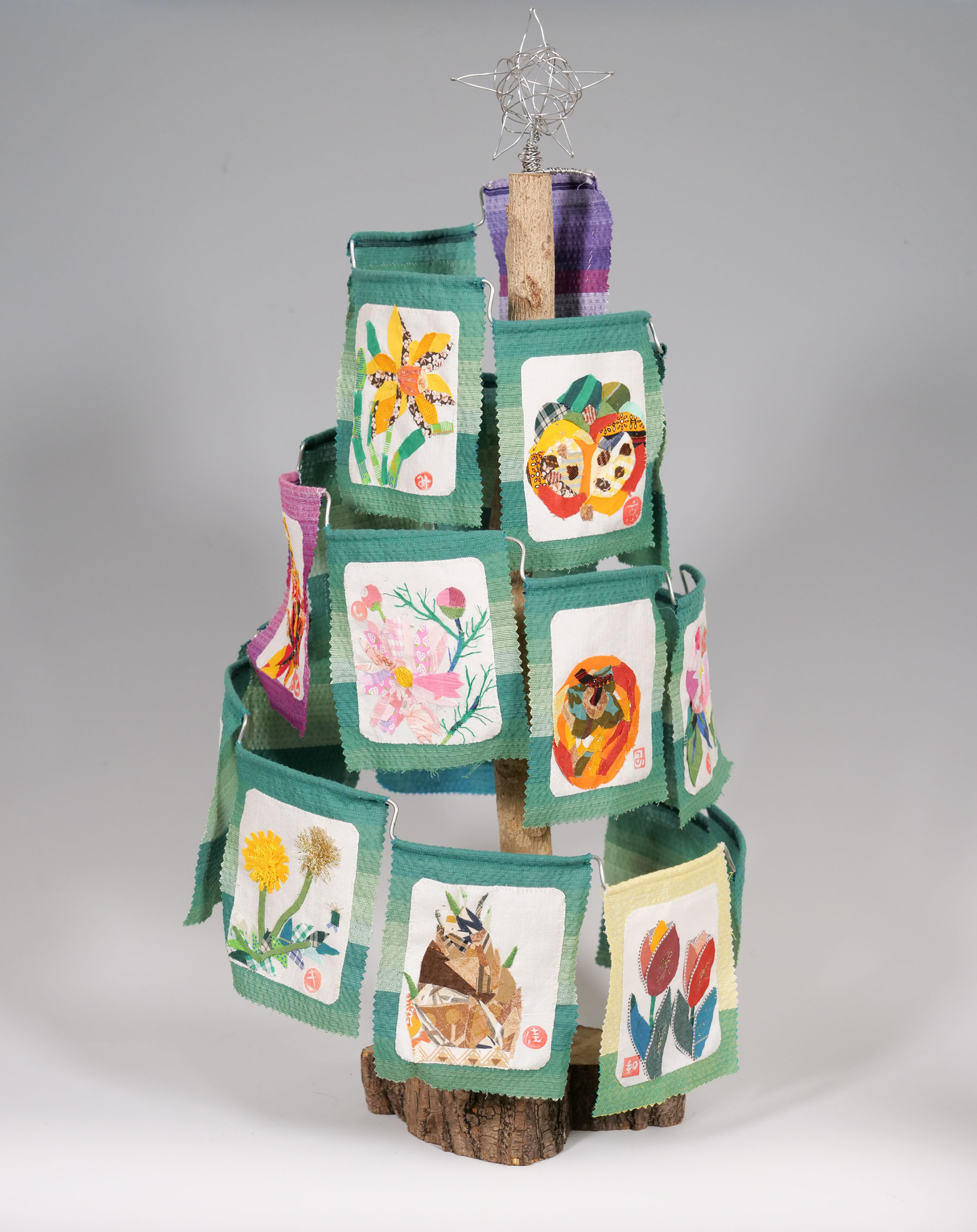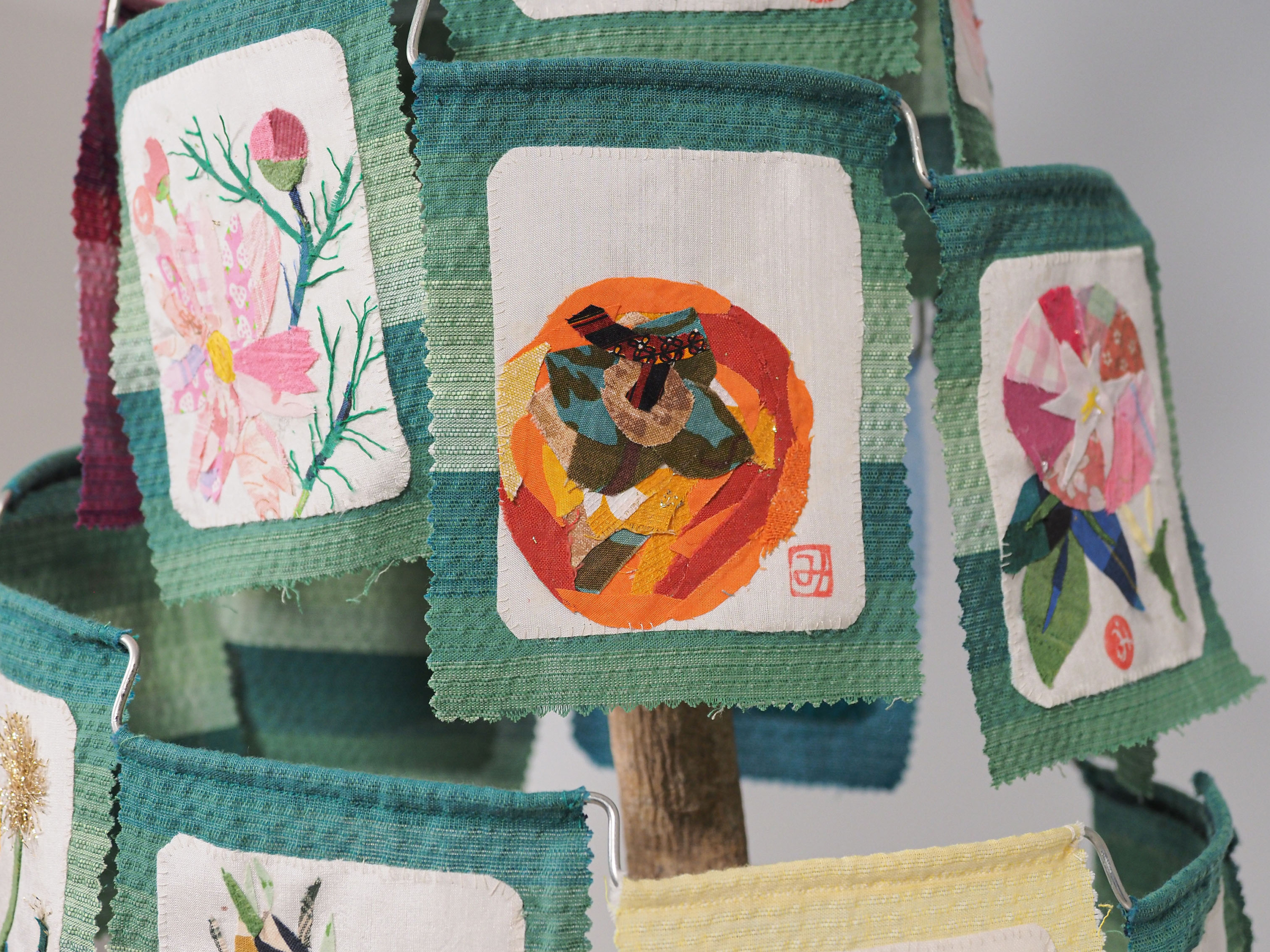 テーマに沿い、季節の花、果物などを布の貼り絵で表現しようと思い、ミニイベントを開き、下絵を参考につくってもらいました。端切れは自宅にあったもの、接着には自然素材のでんぷん糊を使用しました。それを阿波しじらの布(購入)に縫い付け、更に針金を使って1本の木のように仕立てました。