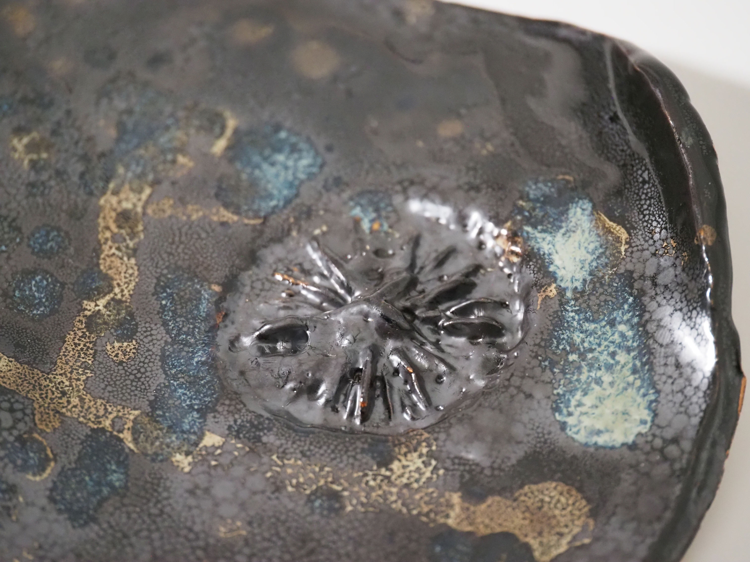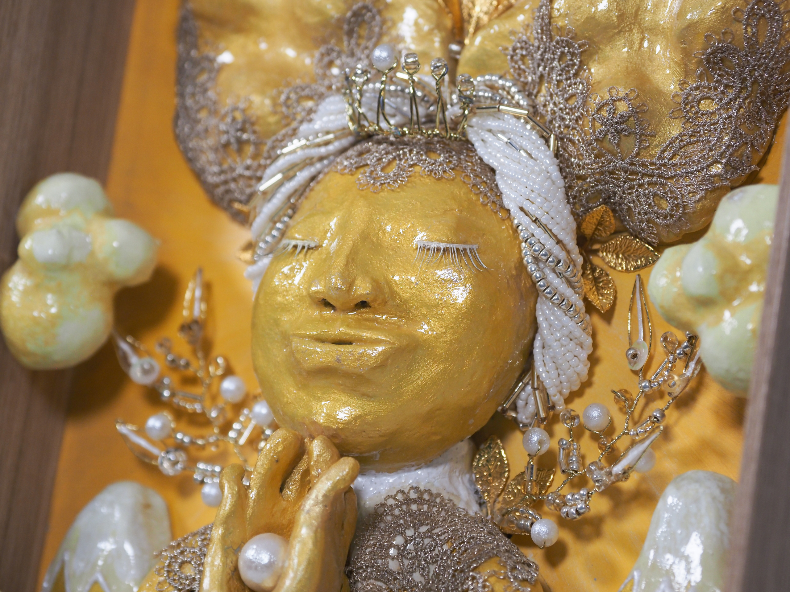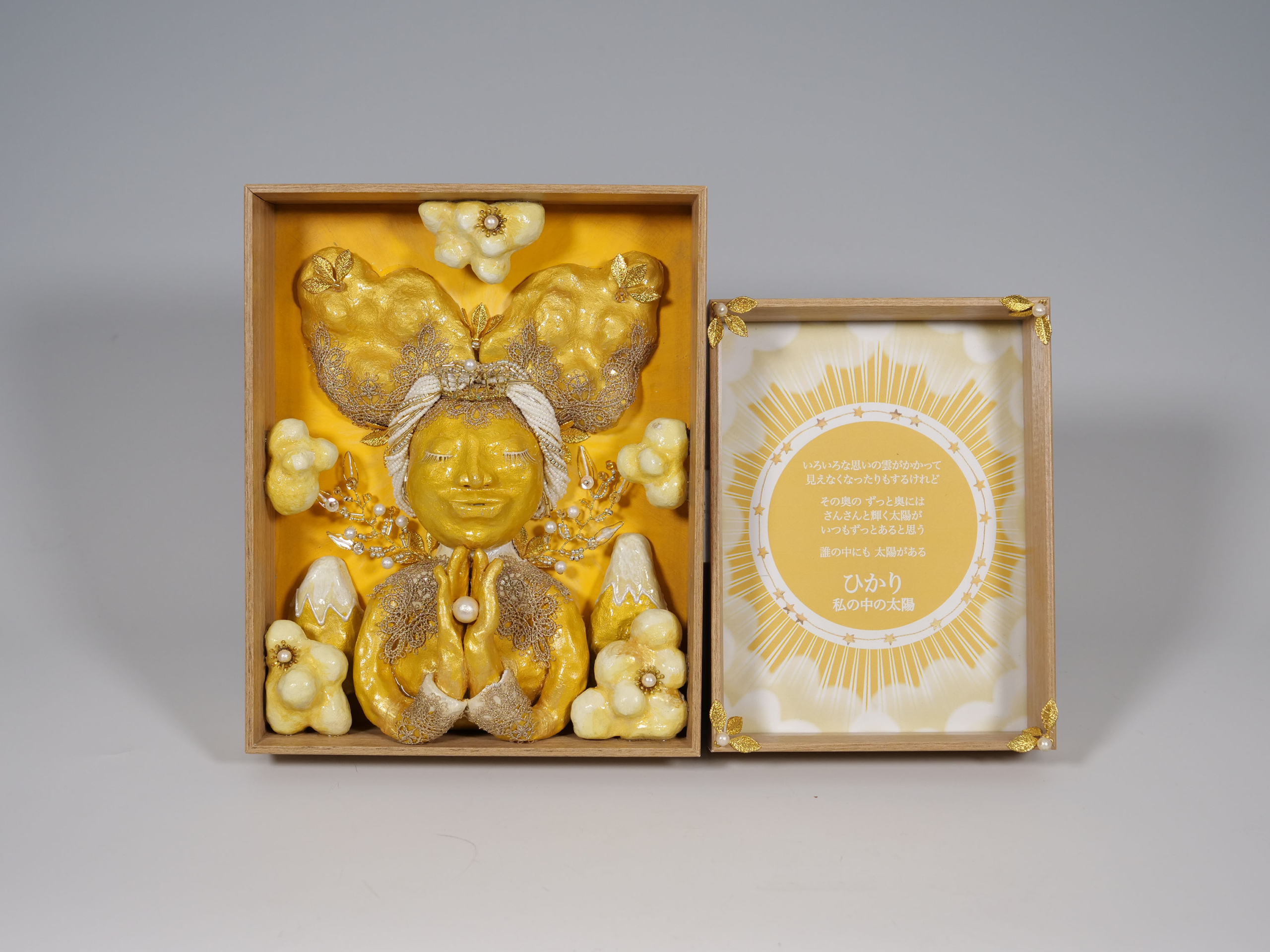 感じていても感じられなくても、いつも心の奥にある「太陽のように輝く眩しい光と喜びの場所」を表現しました。作品に込めたメッセージを詩に書いて、ふたつでひとつの作品にしました。土台となる粘土の部分を、天然の土や石粉、樹脂などの素材を使った彫塑粘土で作製しています。