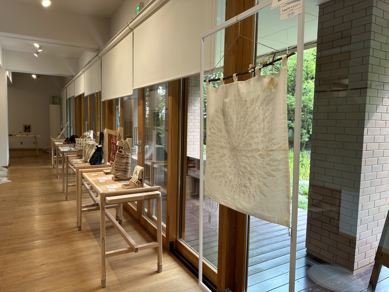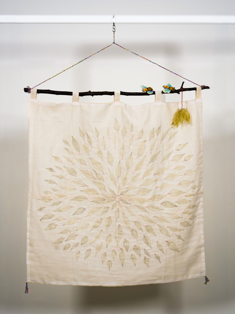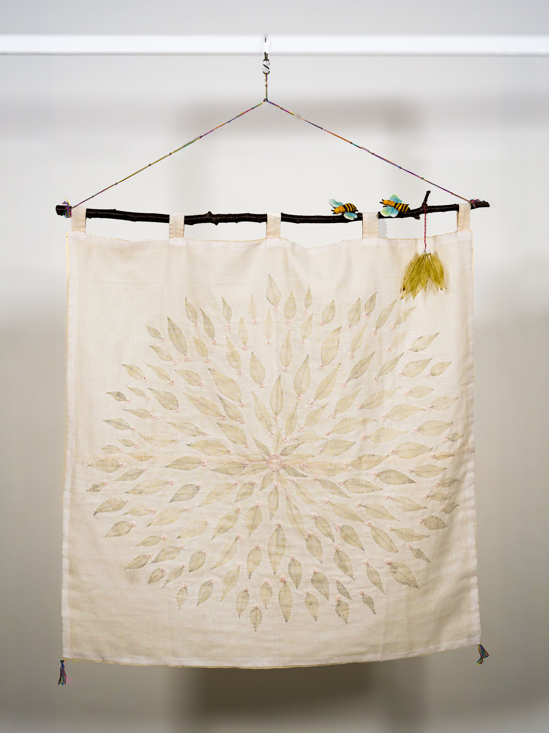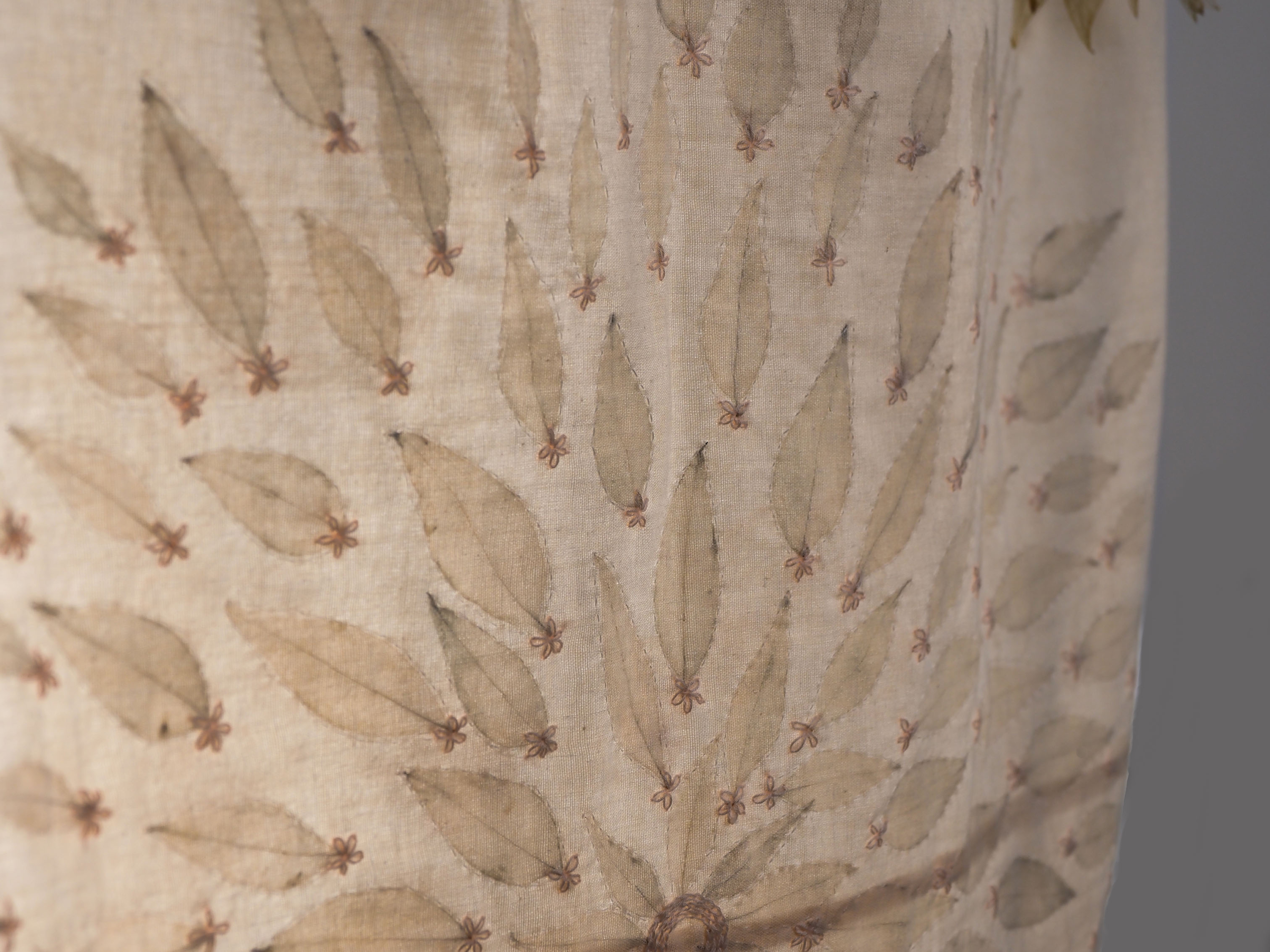 葉っぱの葉脈の美しさに惹かれ、スケルトンリーフに挑戦しました。庭の南天の葉を重曹水で煮、歯ブラシで優しく葉肉を落とします。椿で染めた晒し布の上にリーフを並べ、延びゆく生命の躍動感を表現しました。また、繊細なリーフを生かすように、全体を淡い色合いでまとめました。全て家にあるものを利用して、制作しました。
