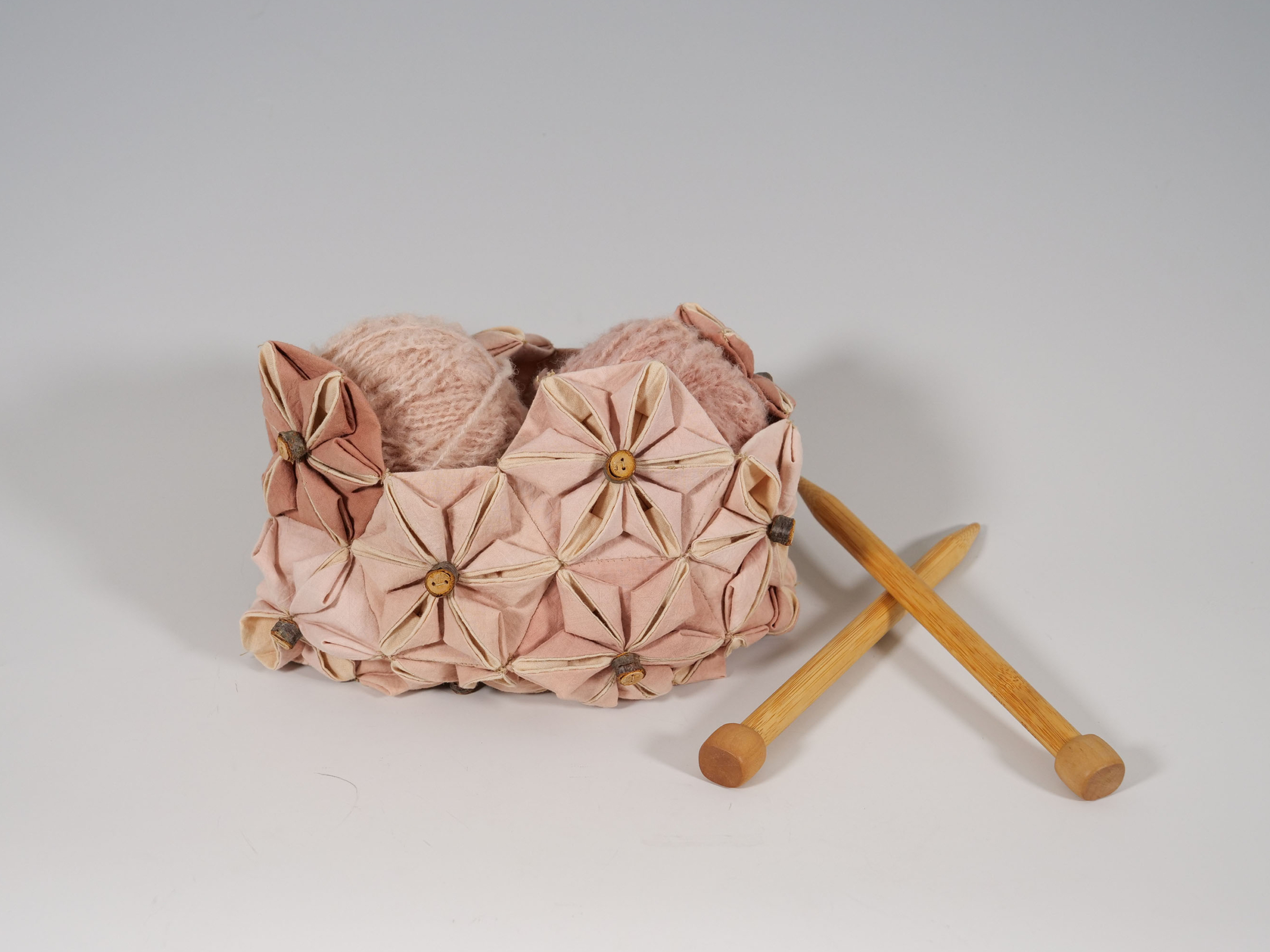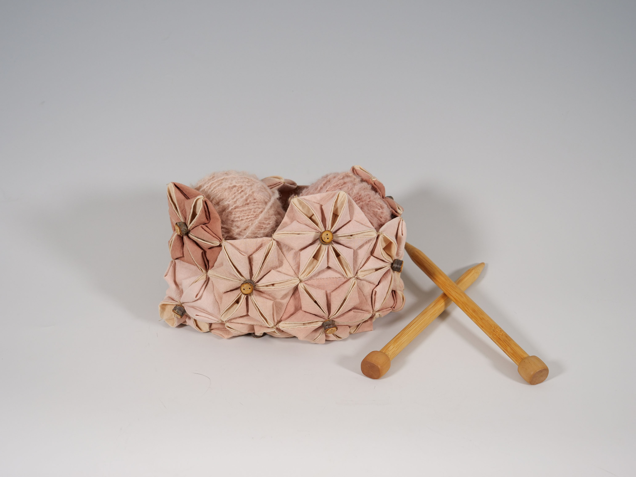 実家の桜の木をなにかの形で残したく、その桜の木を使っての草木染。春に咲いた桜は、夏から冬にかけて命を育み、さらに楽しませてくれます。綿100%の生地を使用。毛糸はヒツジ虐待が禁止されているニュージーランド産の毛糸を使用。黄色い布は桜の葉の部分、ピンクは枝から抽出。命の息吹を感じます。