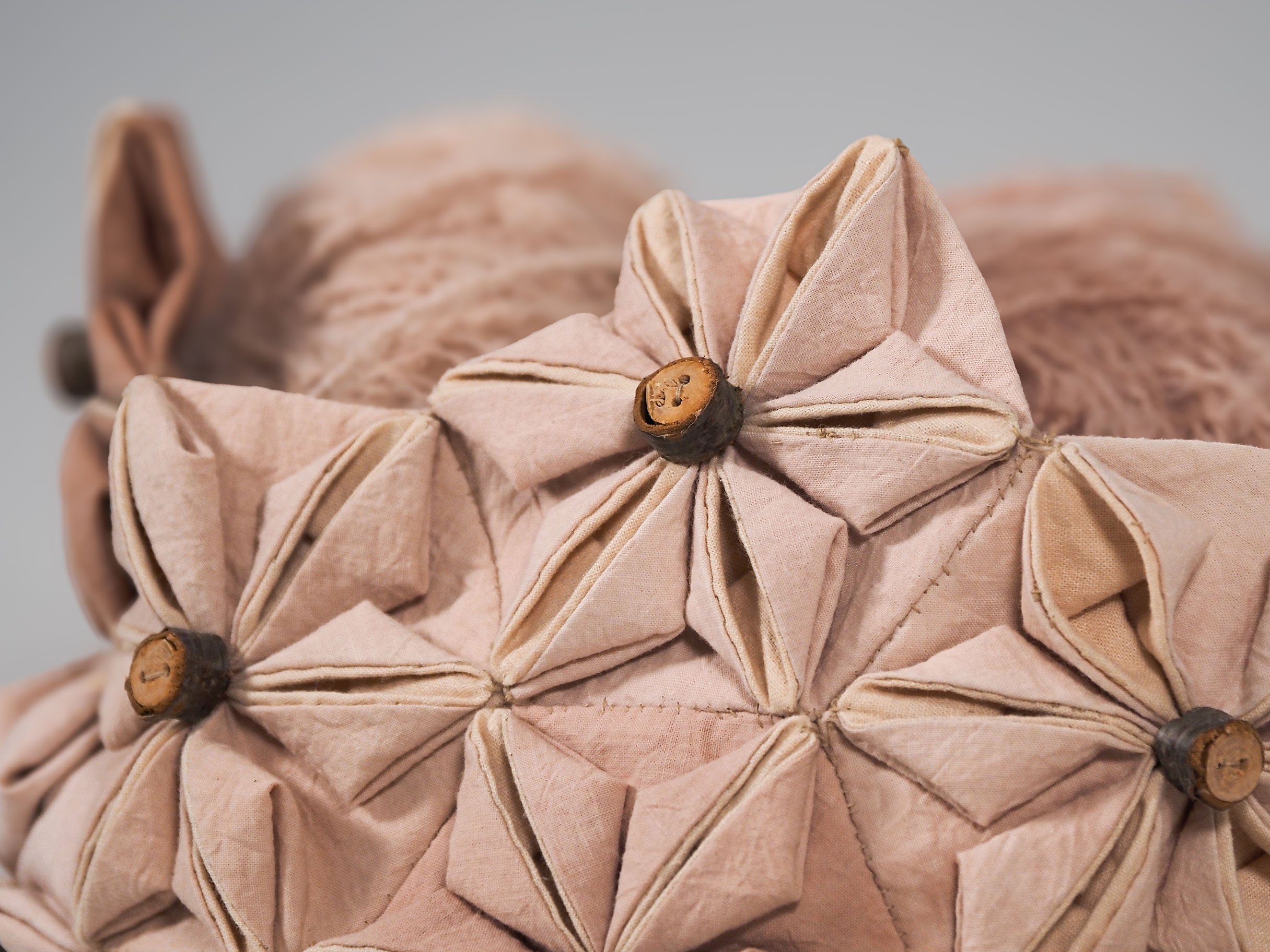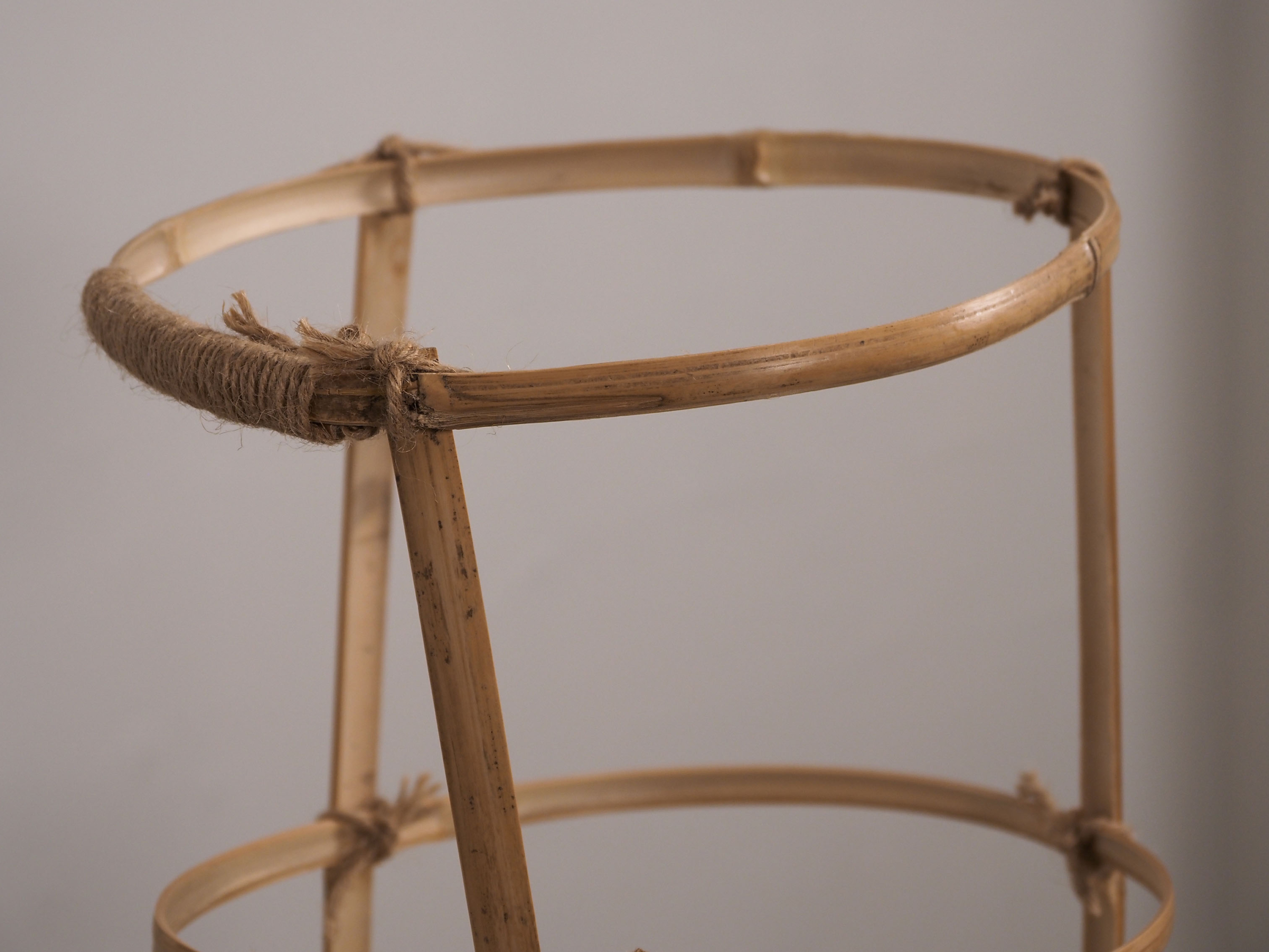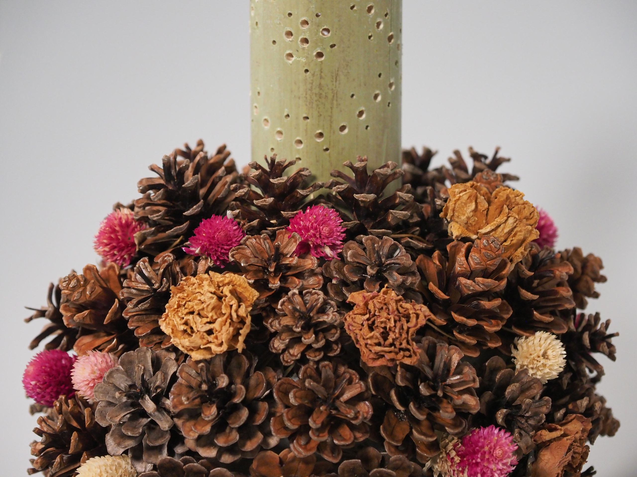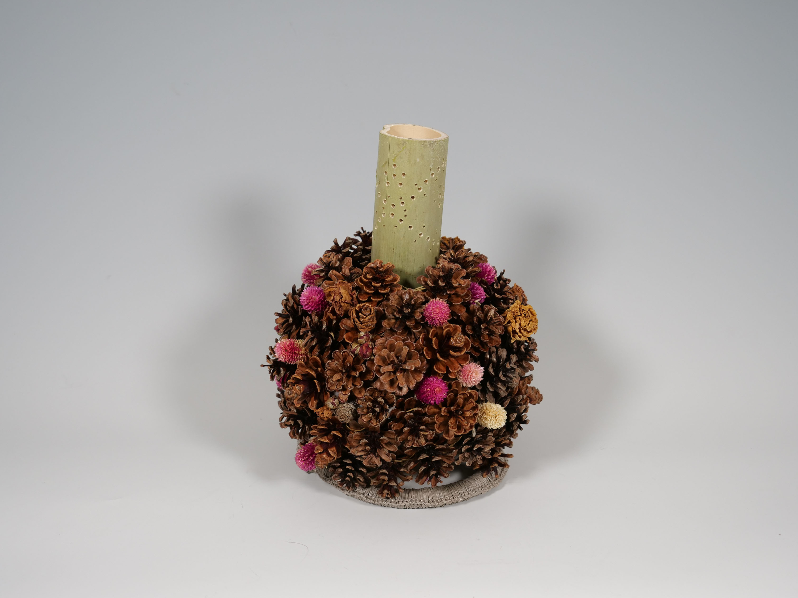 この作品は、風船に紙の糸を巻付け糊で固めたものが土台となっています。それに紙の糸で連ねた松ぼっくりを飾り付け、固定するのに天然綿を使いました。ドライフラワーを差し込むと、枯れたいのちが生き生きと喜んできて、竹の筒にドリルで穴をあけて梅の花を描くと、めでたく「松竹梅」の花器となりました。自然の恵みに感謝します。