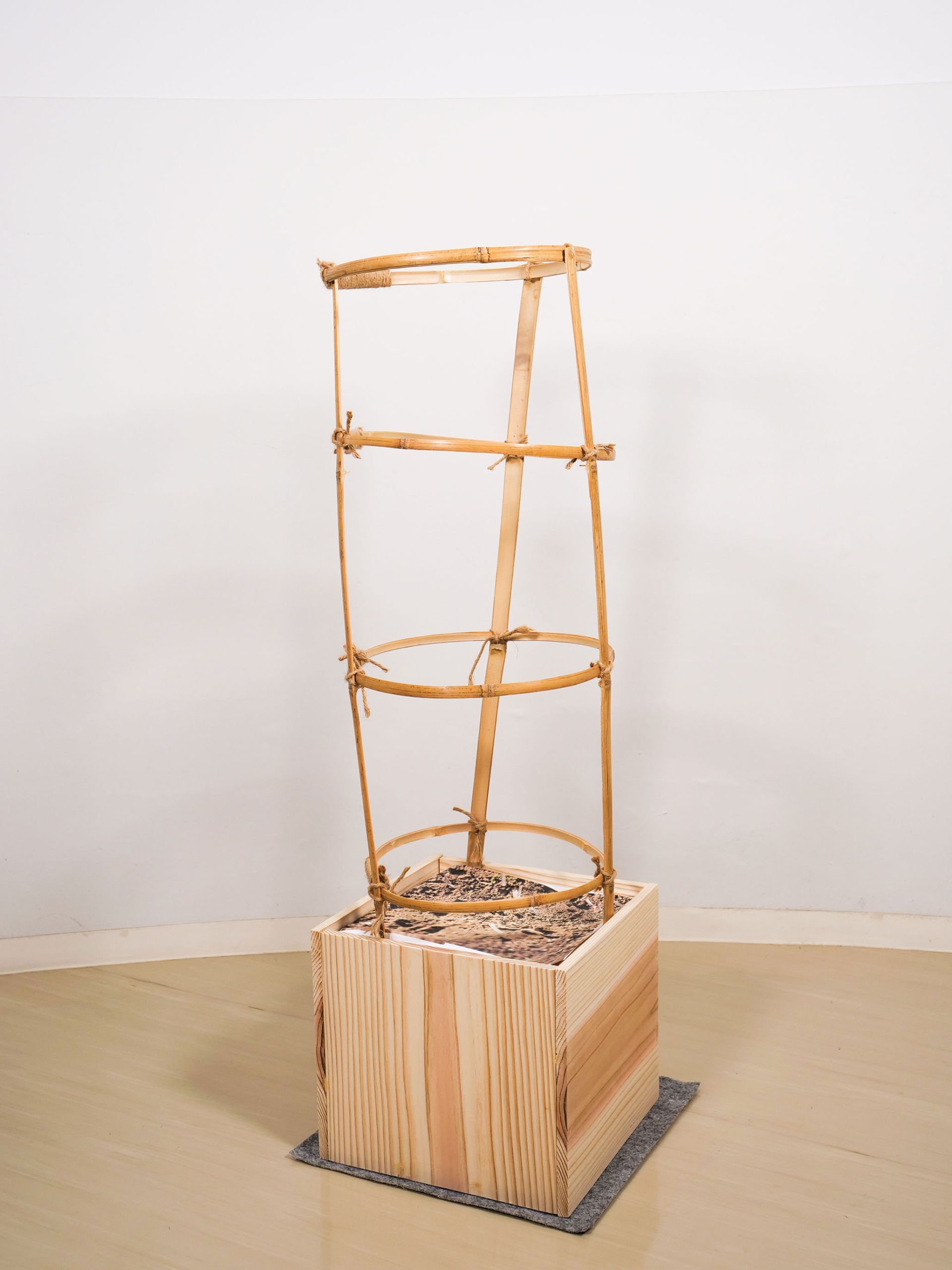 地球上の生命体は全体の8割が植物、動物はわずか1割未満。その植物がいなければ人間は生きていけないのにも関わらず軽視している。感謝なく単なる利用物と思っているようにも思える。菜園のプラ素材の道具はその象徴として感じることも。本来一体で共に伸びる生命であり、その役割を補助する支えを自然素材で表現した。