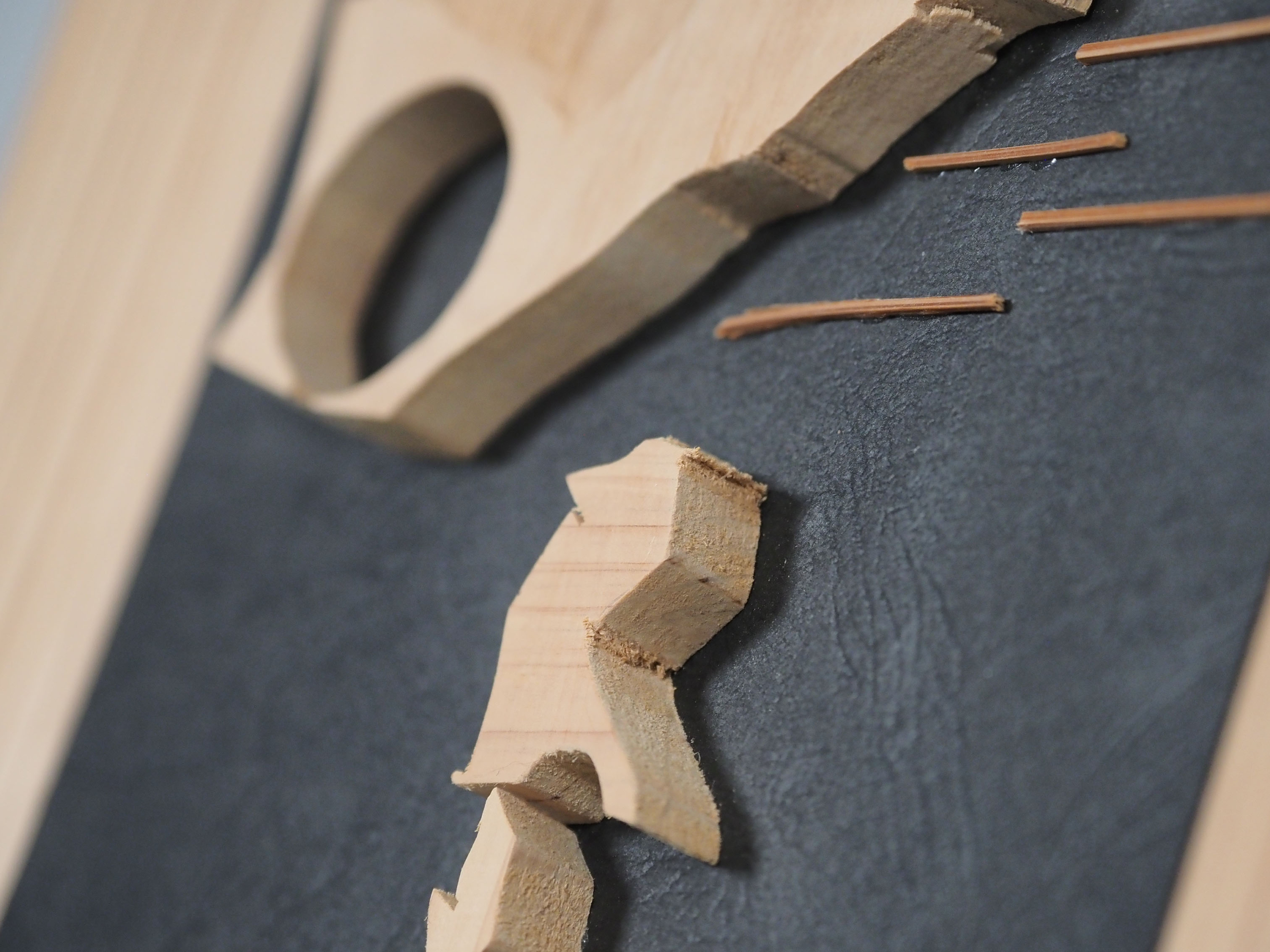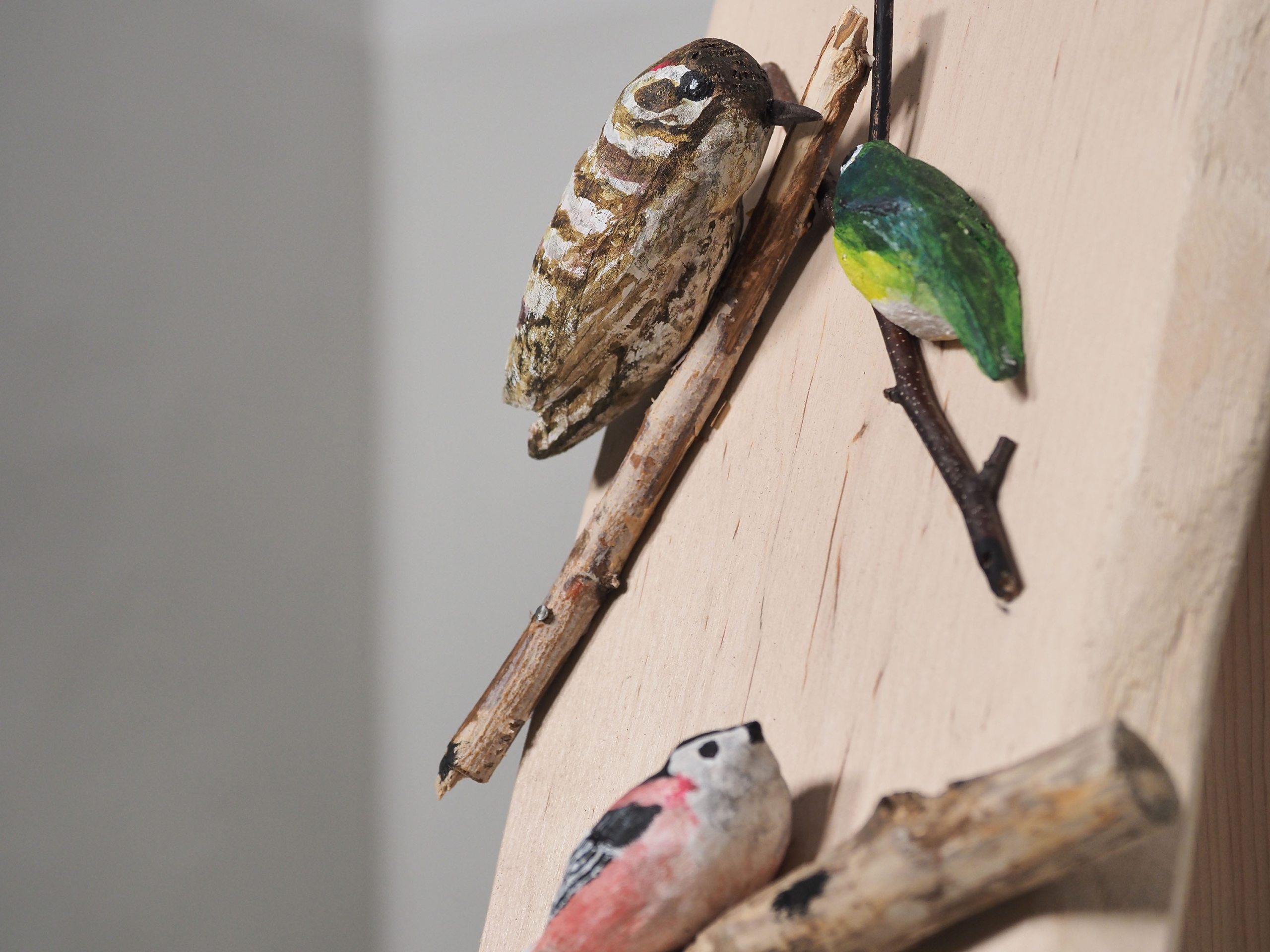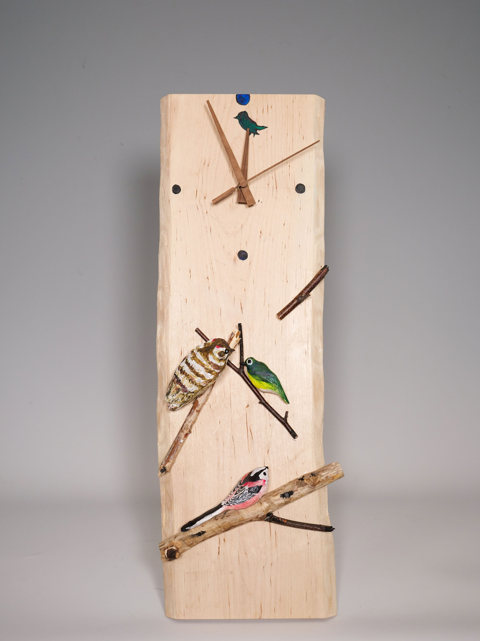 白樺材で壁掛け時計を、端材で3羽の鳥(上からコゲラ、メジロ、エナガ)をつくりました。同じ時・空間を生きる仲間で「飛翔」という特長を持つ鳥に私は憧れ、約10年前から観察し、元気をもらいました。この「鳥時計」で難儀したのは木彫りの鳥。膨大な時間を掛けましたが、つぶさに観察してきた成果が出ていたら幸いです。