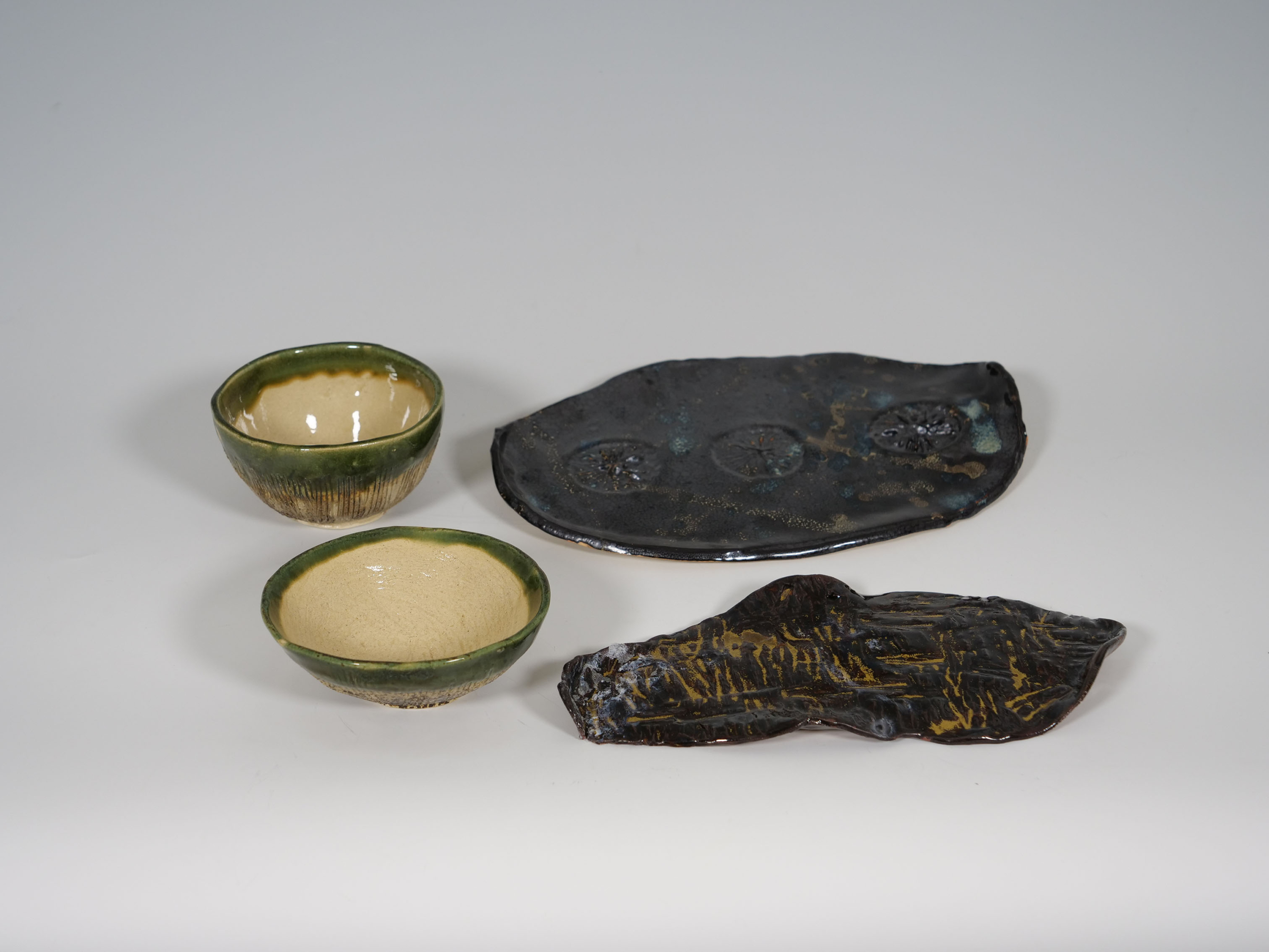 近くの公民館で陶芸教室のお知らせがありました。自転車で通える距離だったので、エコだと思い習いに行きました。2つのお皿は、レンコンの切れ端を粘土においてつくりました。2つのお茶わんは、以前母が老人介護施設で教えてもらいつくったものを、記念に大切に保管していたものです。手づくりの楽しさを実感しています。