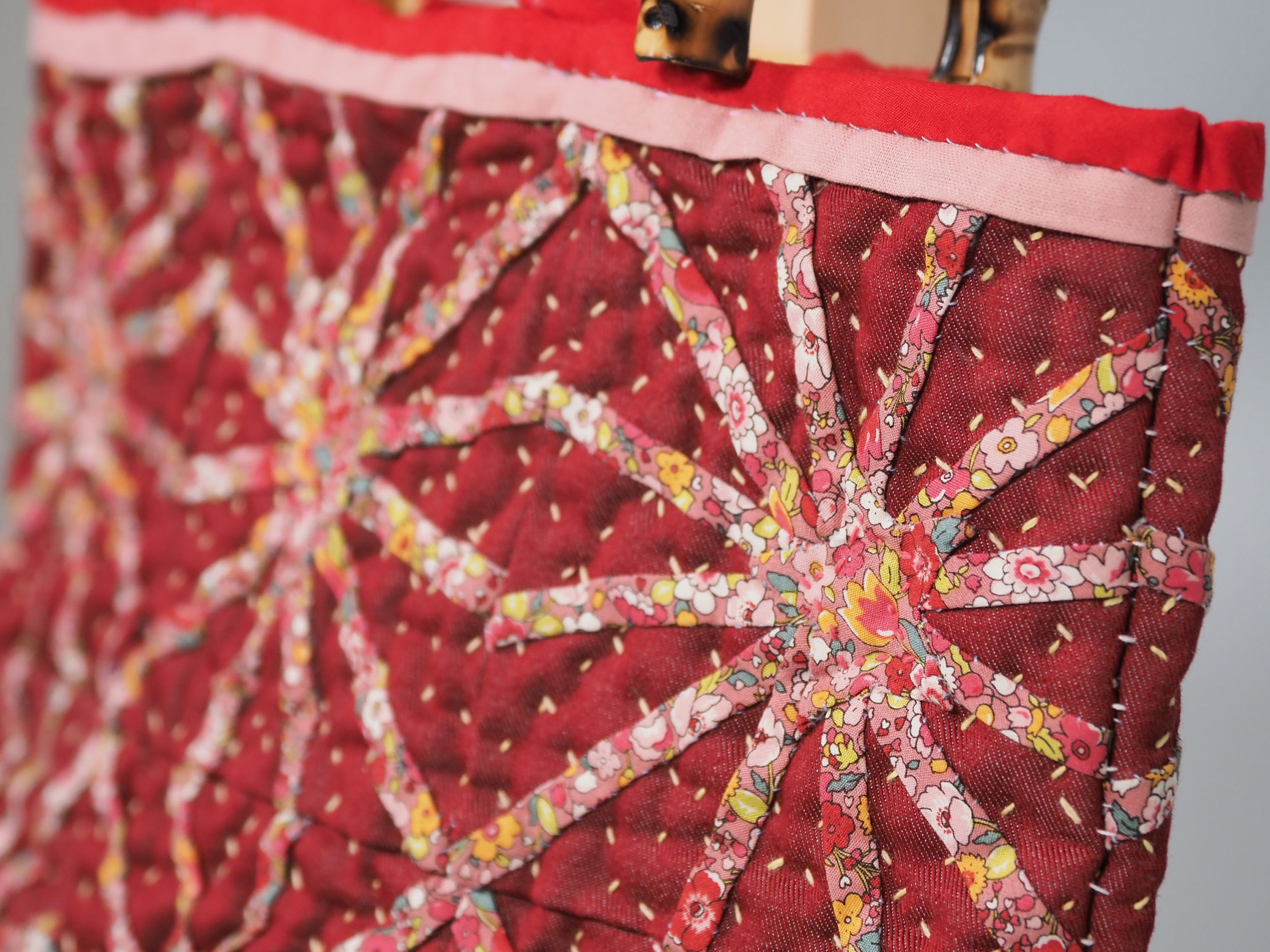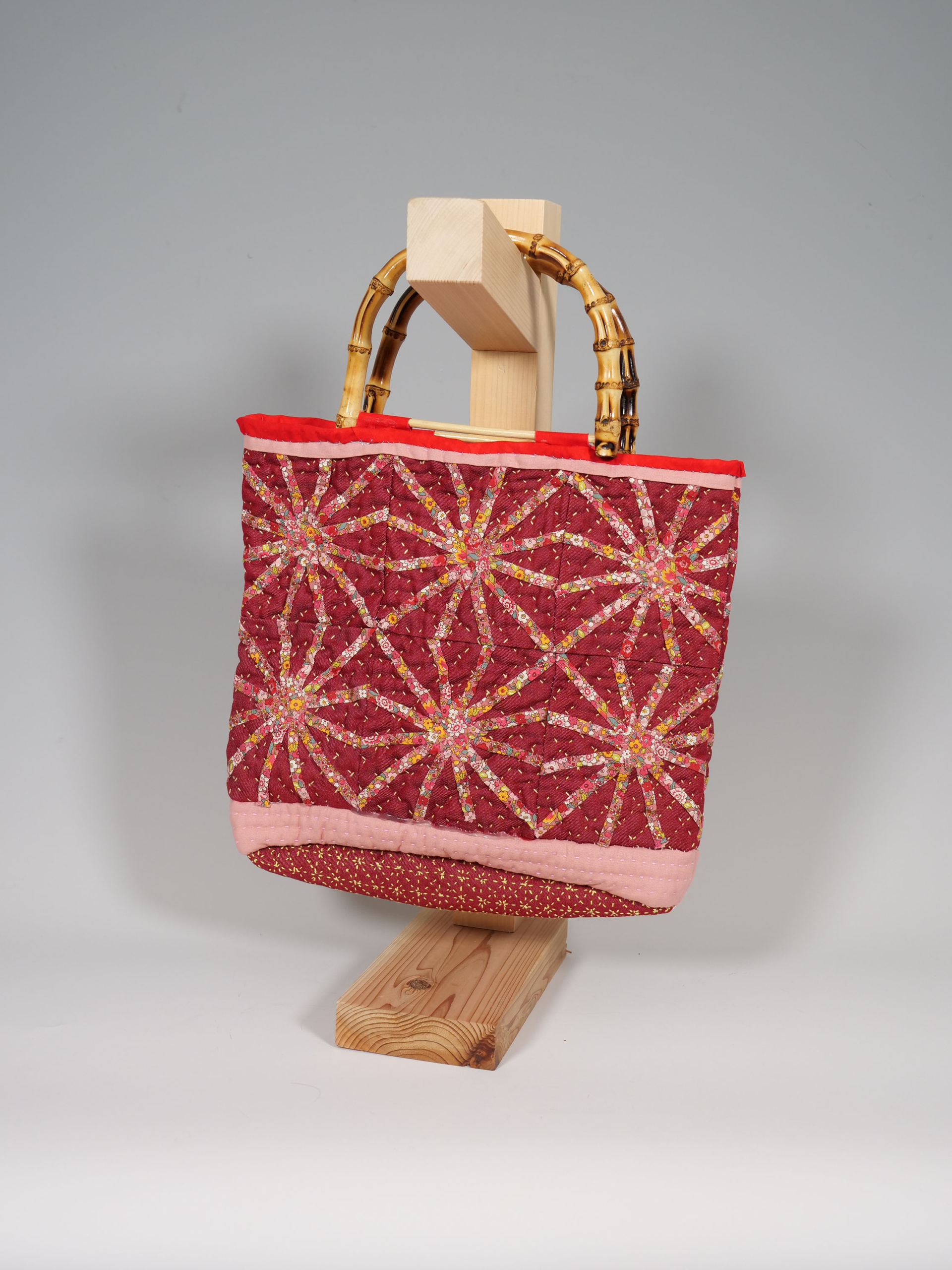 パッチワーク大好きでつくりました。12月の寒い時期につくりました。持ち手も自然のものを使いました。全部手縫いです。キルティングのししゅう糸をこだわりました。ちょう結びというパッチワークのパターン(模様)のトートバッグです。つくるのに3ヶ月と3週間かかりました。お気に入りの作品の1つです。