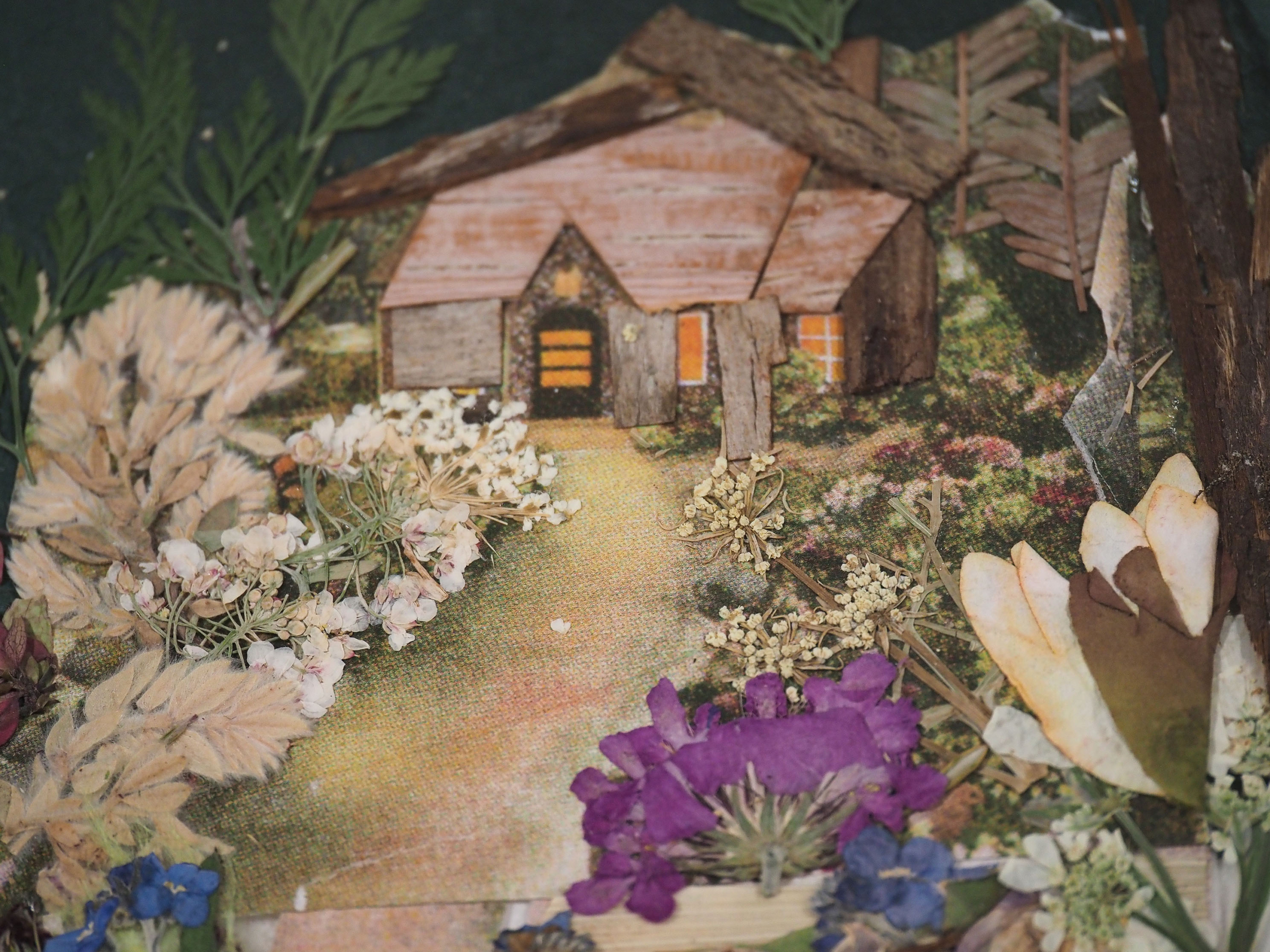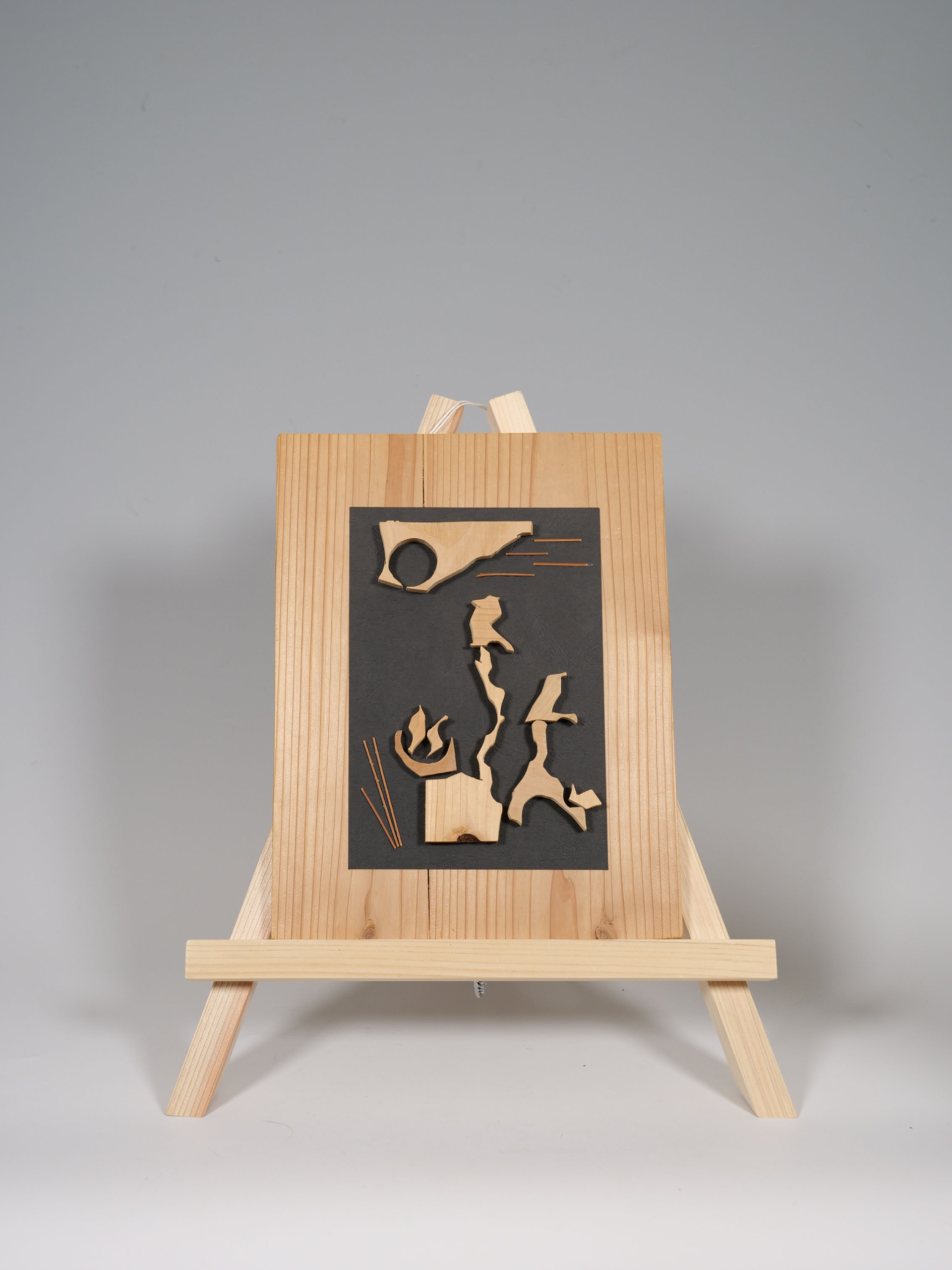地元の間伐材の板を使って、動物などの小物を制作しています。小さな木片がたくさんできますが、その1つがフクロウに見えました。ある1つは月に見えました。そうしたら、フクロウが棲んでいる森を描きたくなりました。たくさんある木片の中からピッタリのものを見つけて描いてみました。