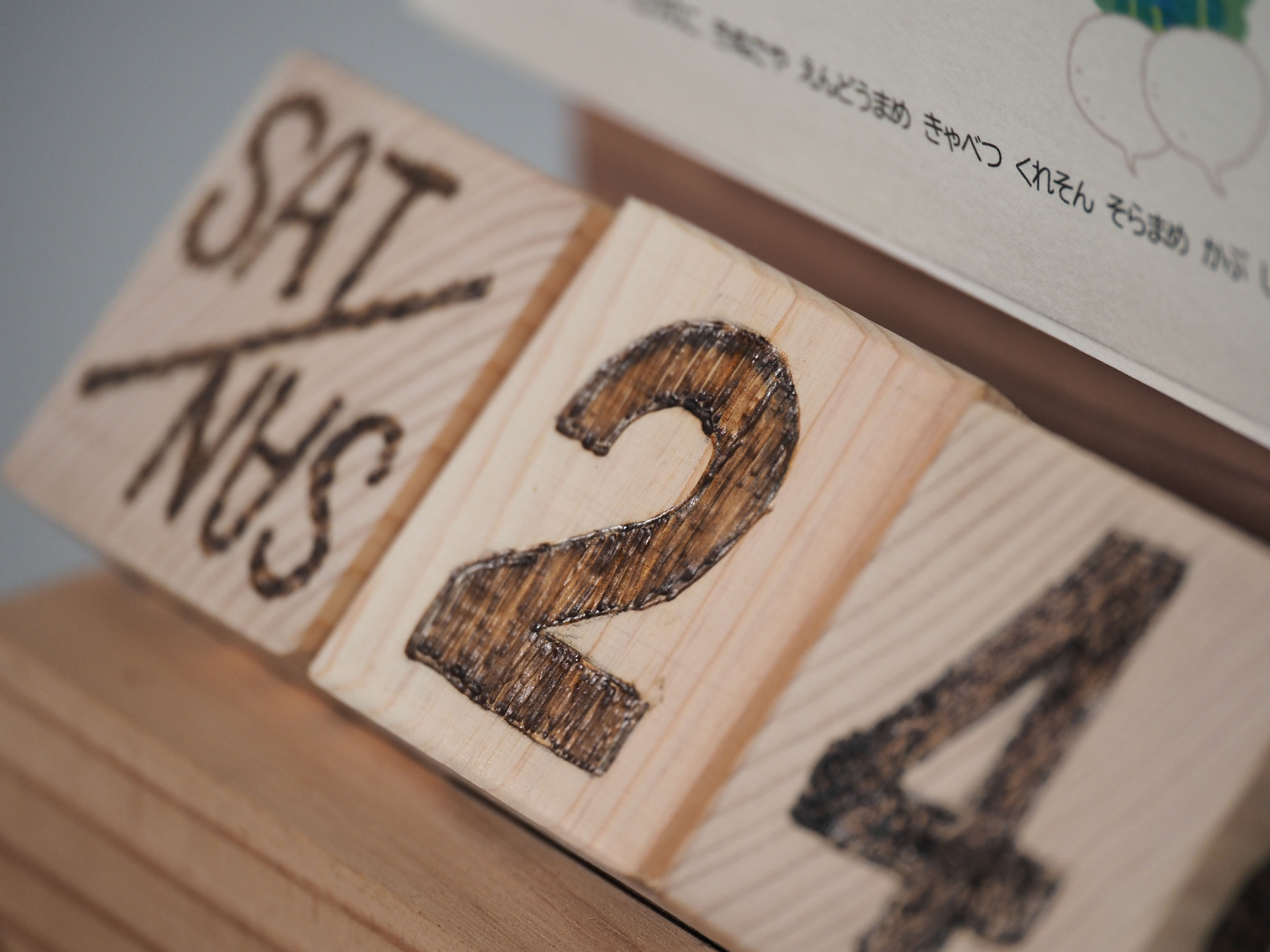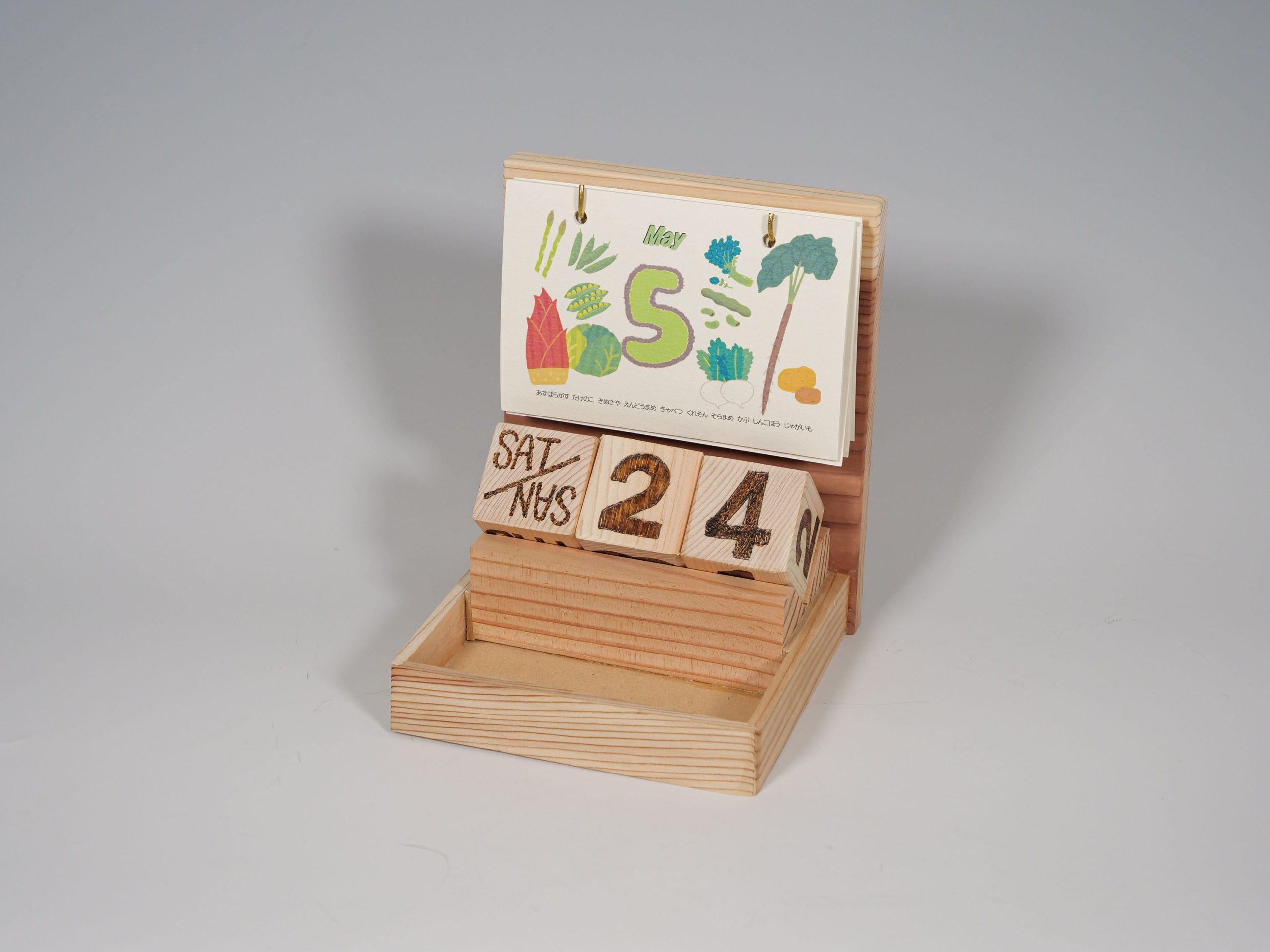 毎日、木製の数字を動かしながら、旬の野菜の絵を見て食生活に取り入れることや、四季を見つめる機会になり、ひらがなの野菜の名前は食育にもつながると思い、お菓子の箱と県産材を使い制作しました。手前のスペースは鍵や文具などの小物入れにして、玄関やリビングなど目につきやすい場所に置くことも意識しました。