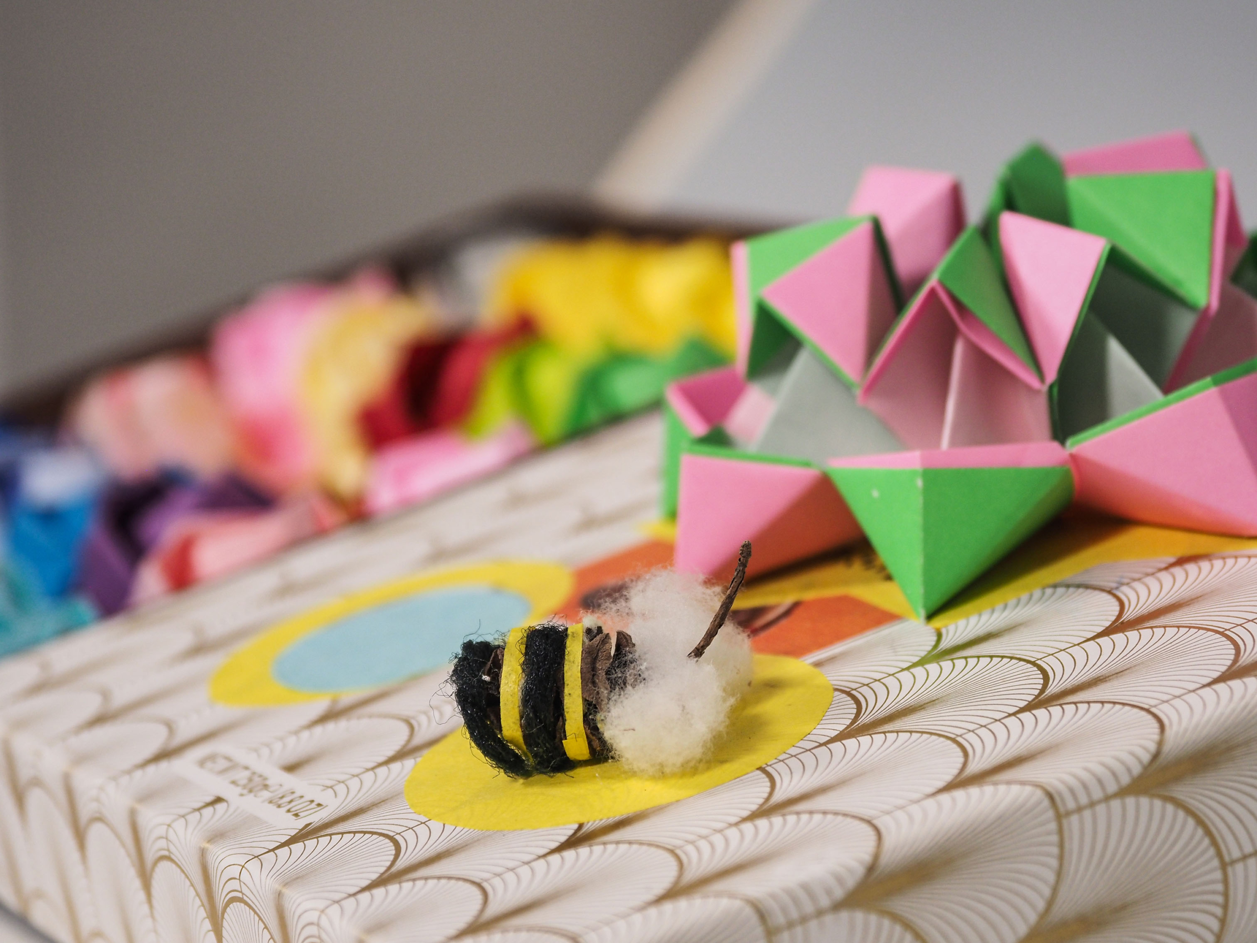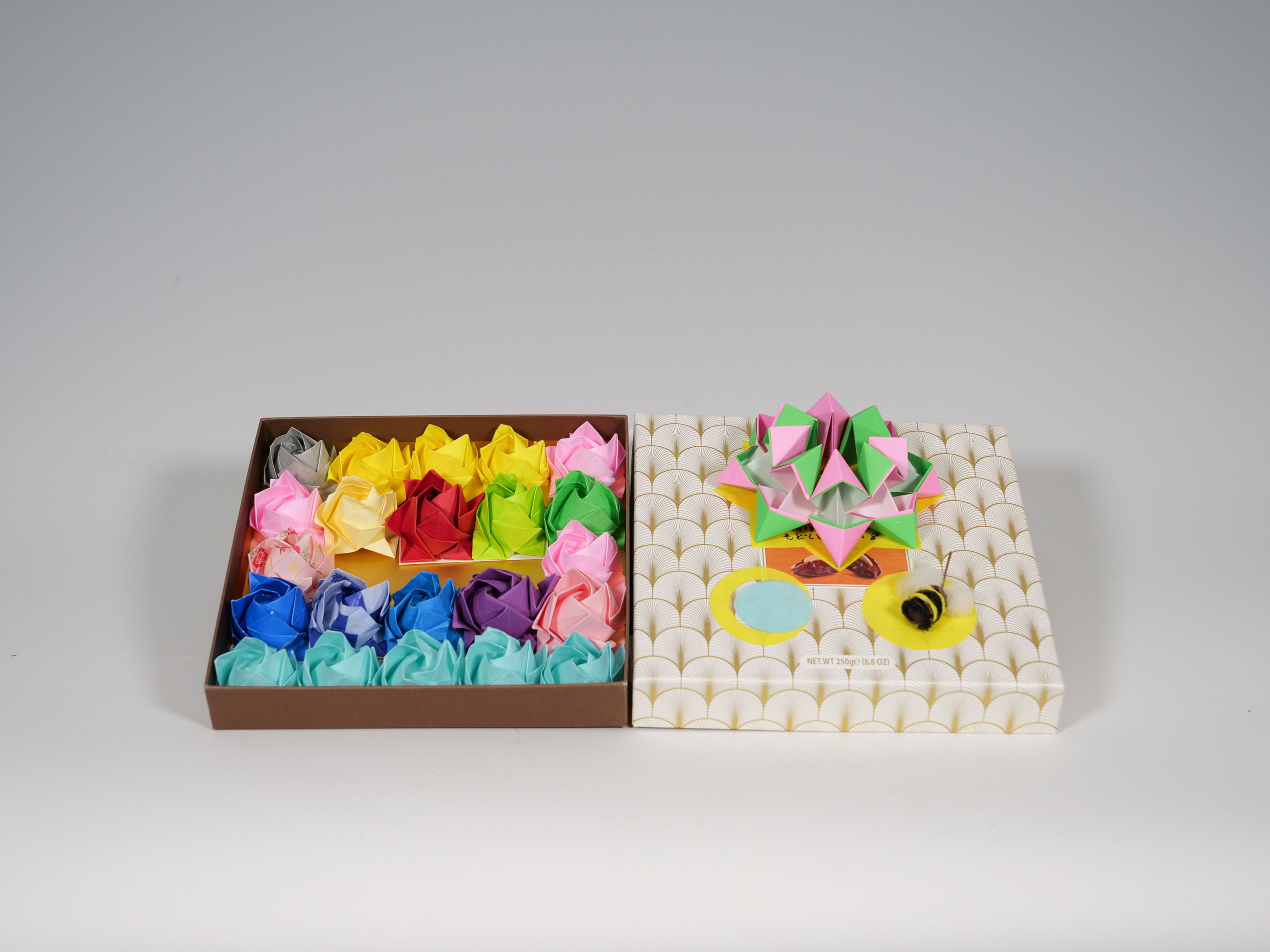 中東のイスラム教国へ旅行したとき、ドライフルーツ空き箱デザインが美しく、内側の金色が砂漠のようで再利用し、異文化異教の人々や自然環境保全を願います。折り紙で折った『つぼみ』→紙質(和紙・洋紙・画用紙・包装紙)を並び替え楽しめます。カライドサイクル→コロナ禍の生命学園ネットフォーラムで作製、回転させ次々替わり遊べます。