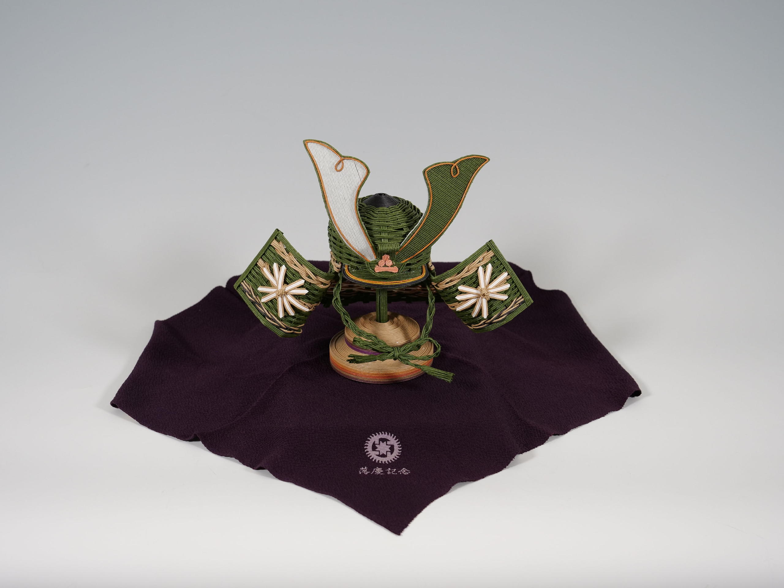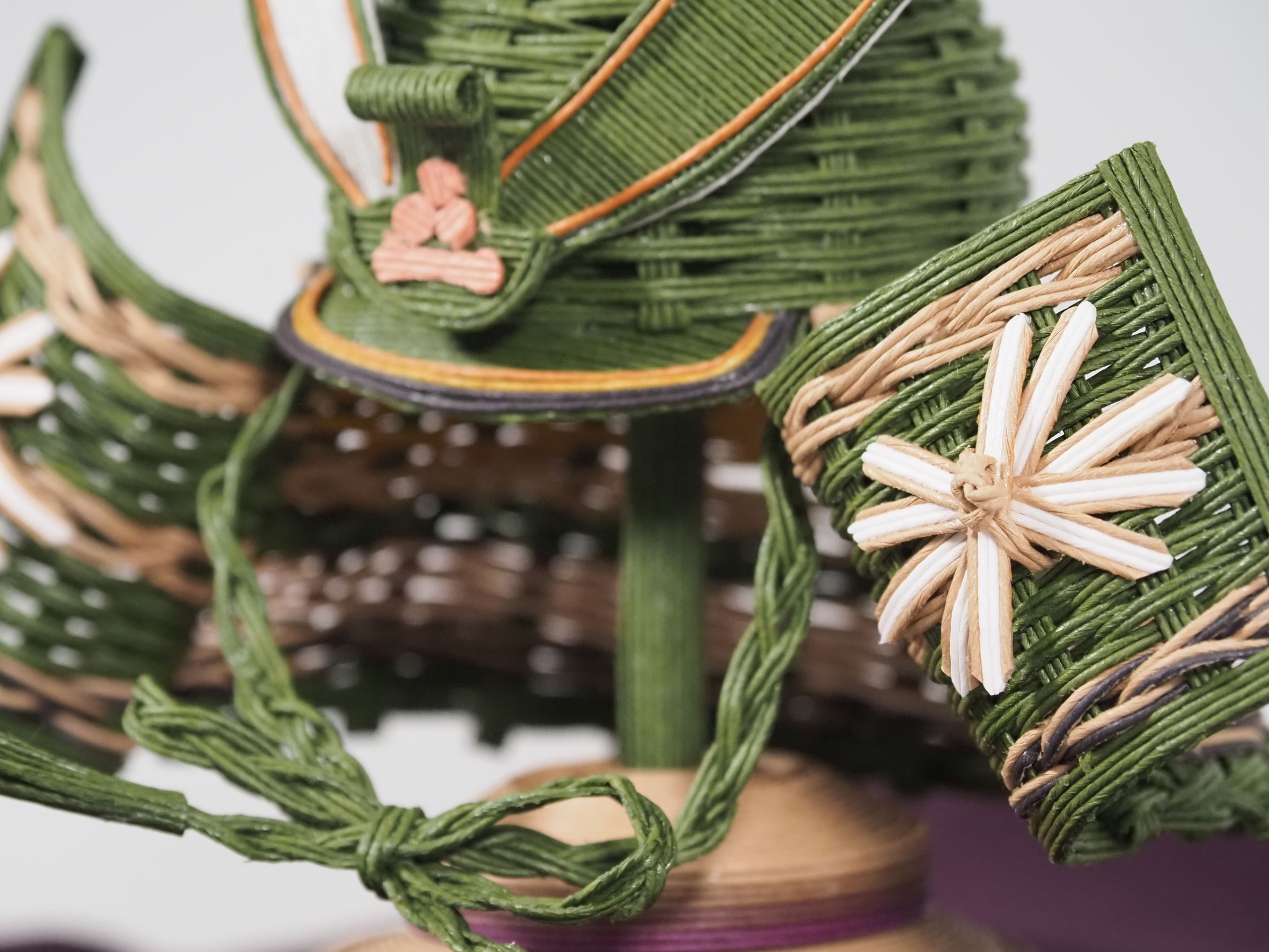 孫の端午の節句のお祝いに手づくりのものをプレゼントしたいと思い、兜を制作しました。エコクラフトテープを使い、プラスチック製品などは使わずエコクラフトテープのみで仕上げました。兜の形は、本や写真を参考にし、配色や飾り、芯木は自分で考え、何度もつくりなおしたり、編みなおしたりしてつくり上げました。