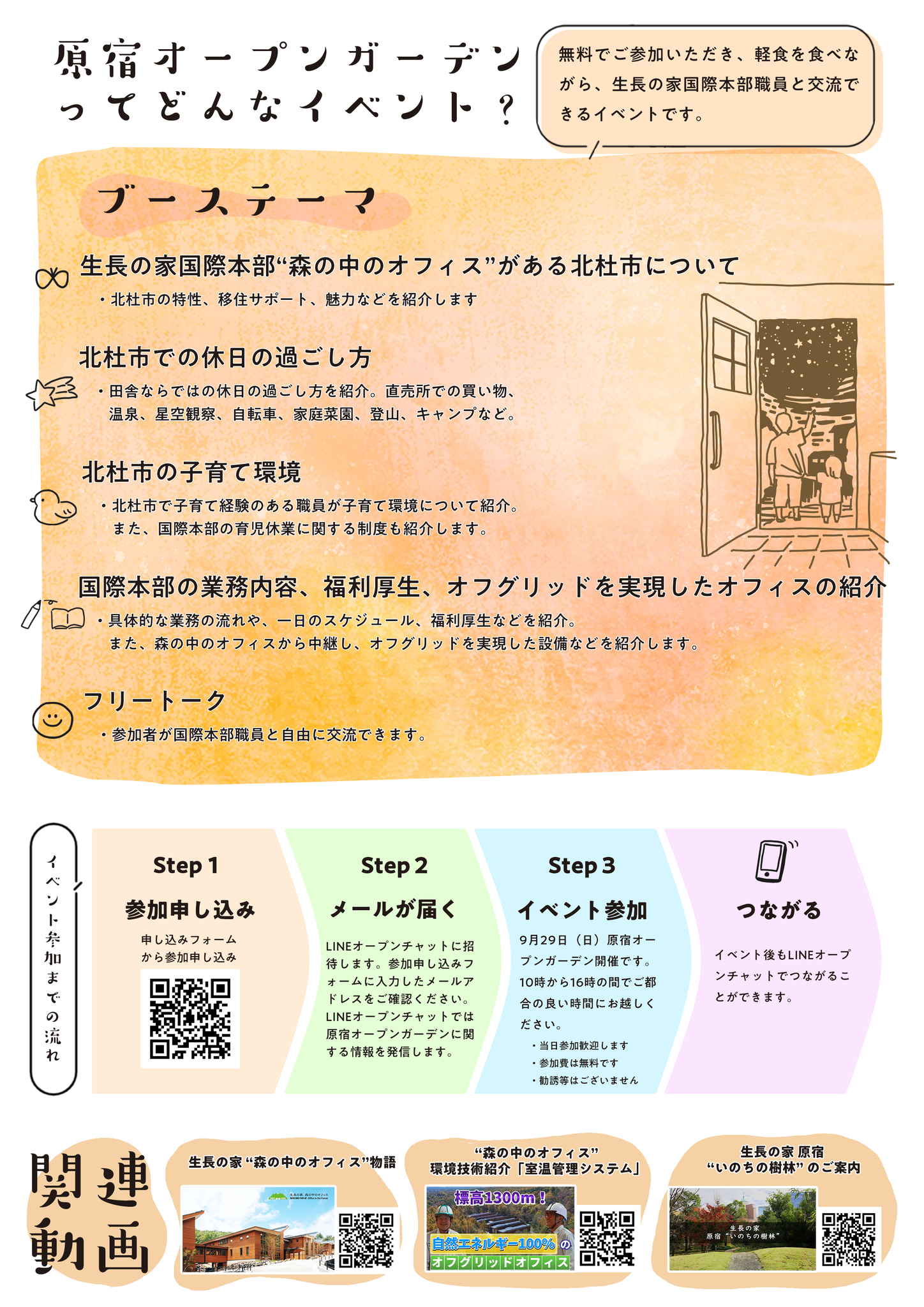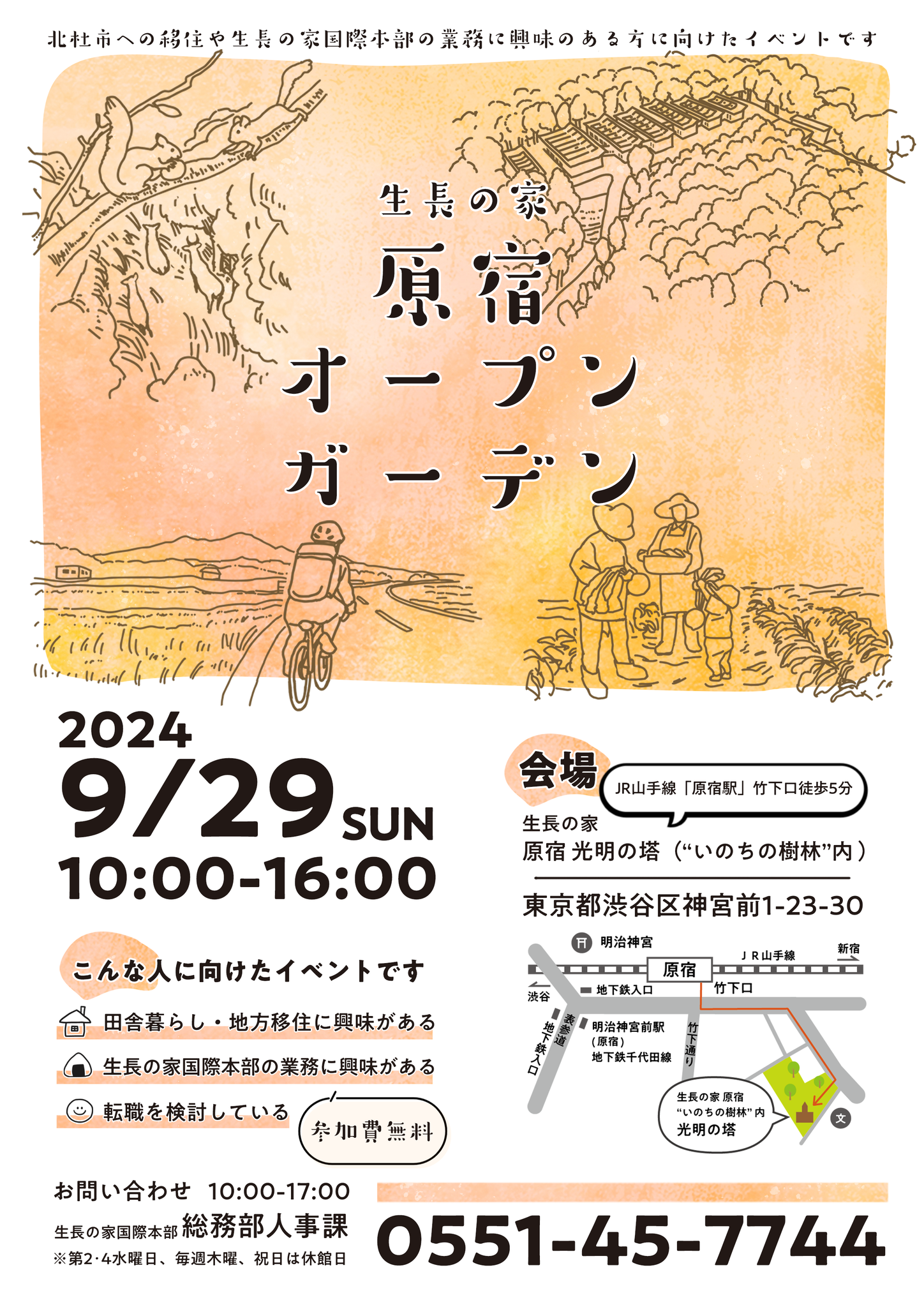 <概要> ⽇時:2024 年9⽉29 ⽇(⽇)10 時〜16時(開催時間中の出入りは自由です) 会場:⽣⻑の家原宿光明の塔 東京都渋谷区神宮前1-23-30(駐車場はございません。公共交通機関でお越しください) (JR「原宿駅」東口から徒歩5分) 対象:転職希望者・転職活動者、地⽅への移住に興味がある⼈