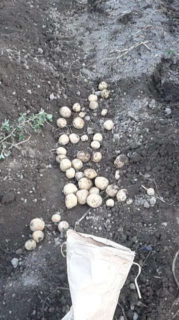 畑の一角にジャガイモが植えてあって、ちょうど収穫期をむかえていたので、母と娘と私とでジャガイモ掘りをしました。