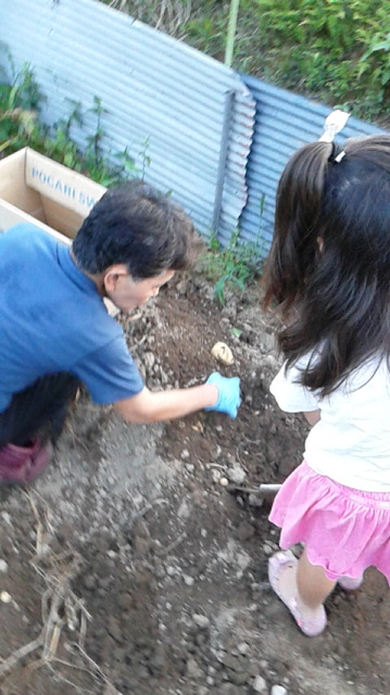 畑の一角にジャガイモが植えてあって、ちょうど収穫期をむかえていたので、母と娘と私とでジャガイモ掘りをしました。
