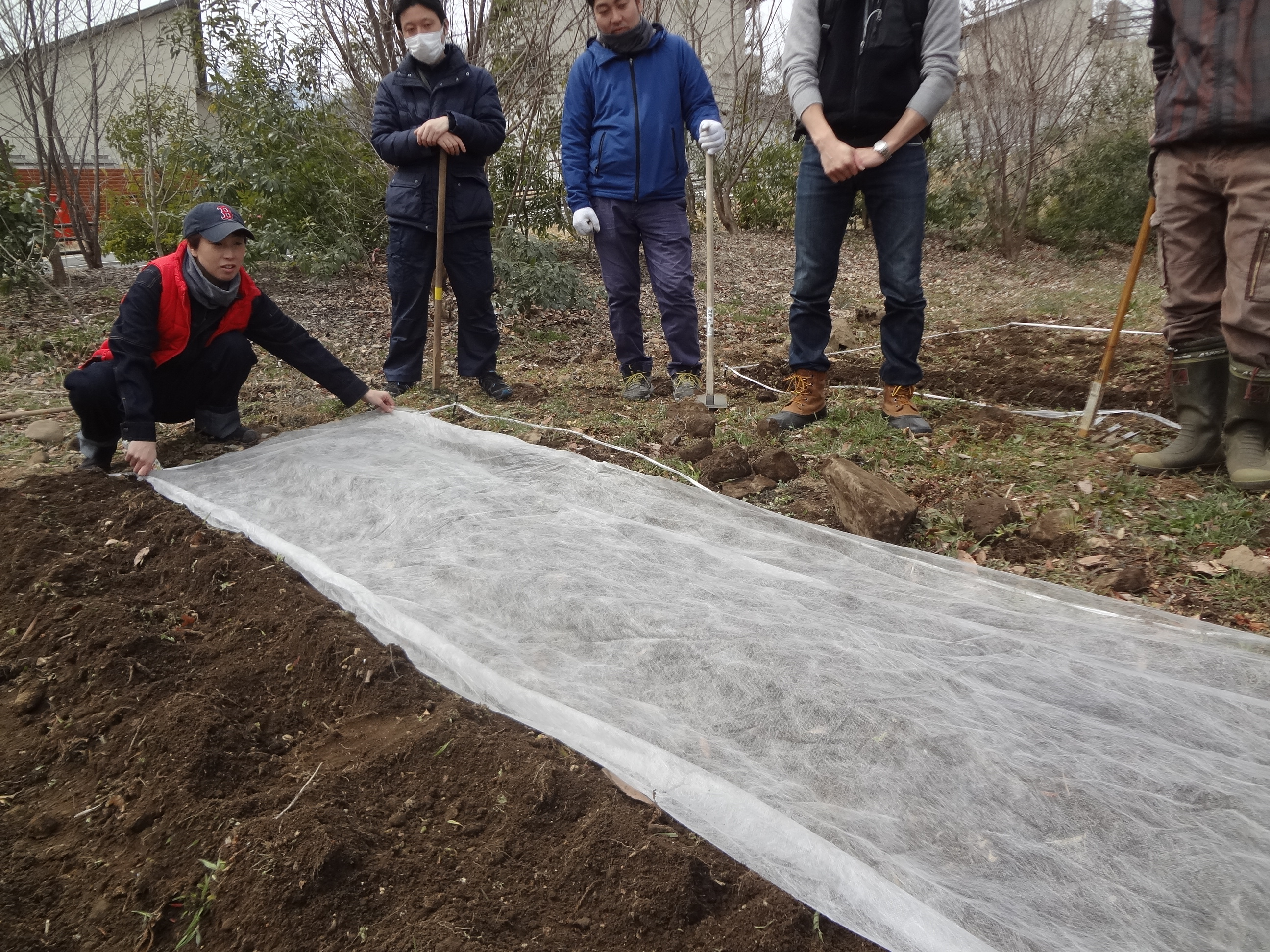 種をまいた後、上から寒さ対策や乾燥を防ぐため不織布をかぶせます。
